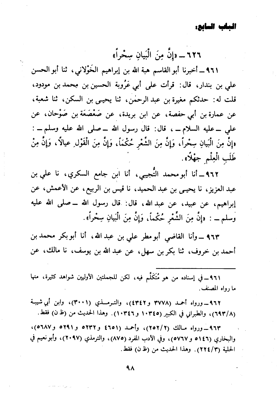961 - أَخْبَرَنَا أَبُو الْقَاسِمِ، هِبَةُ اللَّهِ بْنُ إِبْرَاهِيمَ الْخَوْلَانِيُّ، ثنا أَبُو الْحَسَنِ عَلِيُّ بْنُ بُنْدَارٍ قَالَ: قَرَأْتُ عَلَى أَبِي عَرُوبَةَ الْحُسَيْنِ بْنِ مُحَمَّدِ بْنِ مَوْدُودٍ قُلْتُ لَهُ: حَدَّثَكُمْ مُغِيرَةُ بْنُ عَبْدِ الرَّحْمَنِ، ثنا يَحْيَى بْنُ السَّكَنِ، ثنا شُعْبَةُ، عَنْ عُمَارَةَ بْنِ أَبِي حَفْصَةَ، عَنِ ابْنِ بُرَيْدَةَ، عَنْ صَعْصَعَةَ بْنِ صُوحَانَ، عَنْ عَلِيٍّ، عَلَيْهِ السَّلَامُ قَالَ: قَالَ رَسُولُ اللَّهِ صَلَّى اللهُ عَلَيْهِ وَسَلَّمَ: «§إِنَّ مِنَ الْبَيَانِ سِحْرًا وَإِنَّ مِنَ الشِّعْرِ حِكَمًا، وَإِنَّ مِنَ الْقَوْلِ عِيَالًا، وَإِنَّ مِنْ طَلَبِ الْعِلْمِ جَهْلًا»