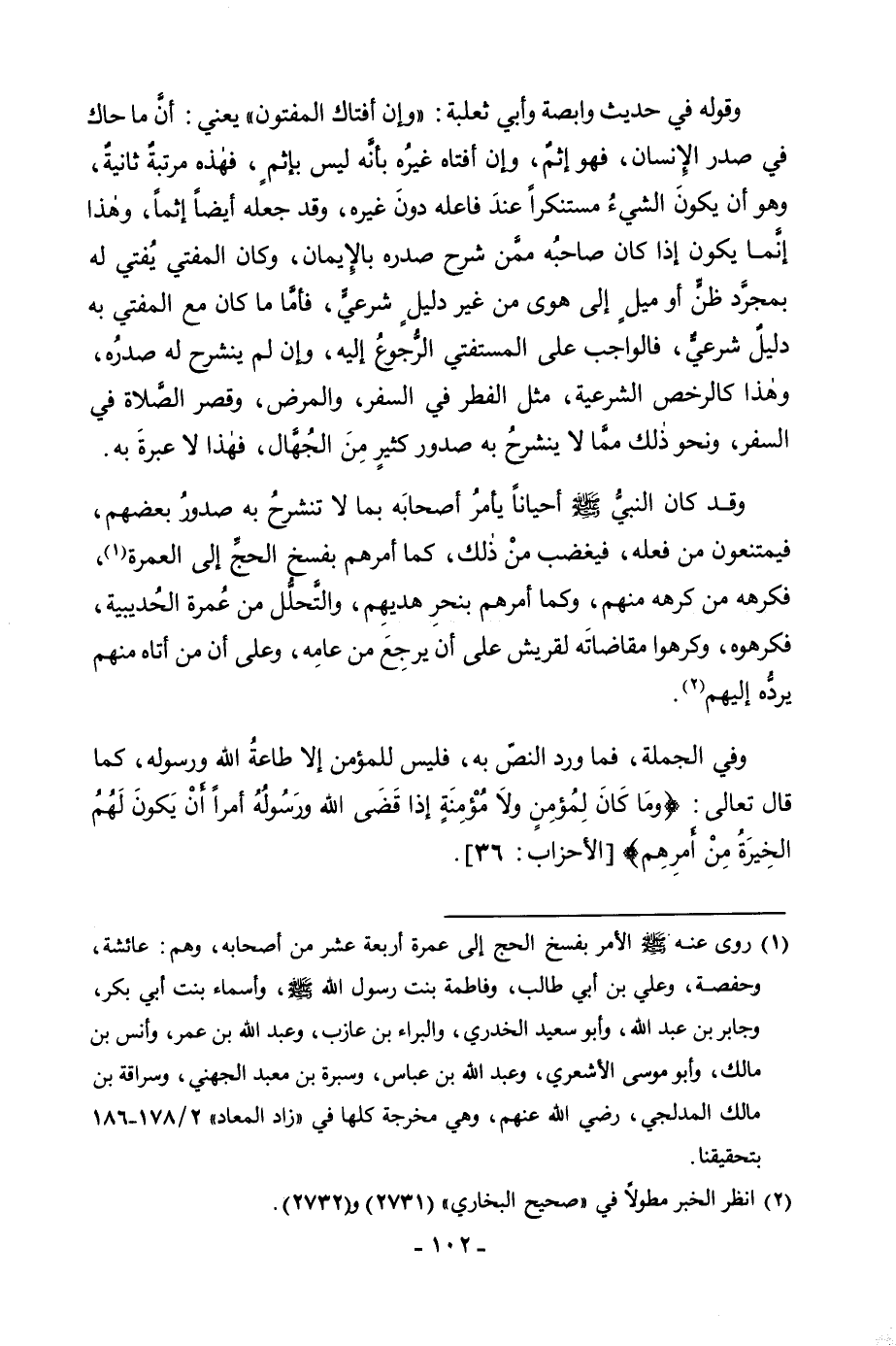 وَقَوْلُهُ فِي حَدِيثِ وَابِصَةَ وَأَبِي ثَعْلَبَةَ: «وَإِنْ أَفْتَاكَ الْمُفْتُونَ» يَعْنِي: أَنَّ مَا حَاكَ فِي صَدْرِ الْإِنْسَانِ فَهُوَ إِثْمٌ، وَإِنْ أَفْتَاهُ غَيْرُهُ بِأَنَّهُ لَيْسَ، بِإِثْمٍ فَهَذِهِ مَرْتَبَةٌ ثَانِيَةٌ، وَهُوَ أَنْ يَكُونَ الشَّيْءُ مُسْتَنْكَرًا عِنْدَ فَاعِلِهِ دُونَ غَيْرِهِ، وَقَدْ جَعَلَهُ أَيْضًا إِثْمًا، وَهَذَا إِنَّمَا يَكُونُ إِذَا كَانَ صَاحِبُهُ مِمَّنْ شُرِحَ صَدْرُهُ بِالْإِيمَانِ، وَكَانَ الْمُفْتِي يُفْتِي لَهُ بِمُجَرَّدِ ظَنٍّ أَوْ مَيْلٍ إِلَى هَوًى مِنْ غَيْرِ دَلِيلٍ شَرْعِيٍّ، فَأَمَّا مَا كَانَ مَعَ الْمُفْتِي بِهِ دَلِيلٌ شَرْعِيٌّ، فَالْوَاجِبُ عَلَى الْمُسْتَفْتِي الرُّجُوعُ إِلَيْهِ، وَإِنْ لَمْ يَنْشَرِحْ لَهُ صَدْرُهُ، وَهَذَا كَالرُّخْصَةِ الشَّرْعِيَّةِ، مِثْلُ: الْفِطْرِ فِي السِّفْرِ، وَالْمَرَضِ، وَقَصْرِ الصَّلَاةِ فِي السَّفَرِ، وَنَحْوِ ذَلِكَ مِمَّا لَا يَنْشَرِحُ بِهِ صُدُورُ كَثِيرٍ مِنَ الْجُهَّالِ، فَهَذَا لَا عِبْرَةَ بِهِ.
