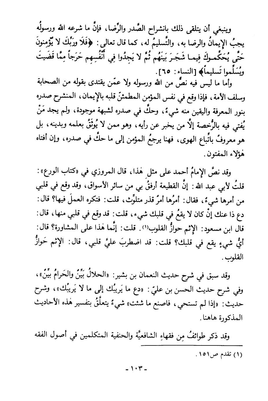 وَأَمَّا مَا لَيْسَ فِيهِ نَصٌّ مِنَ اللَّهِ وَرَسُولِهِ وَلَا عَمَّنْ يُقْتَدَى بِقَوْلِهِ مِنَ الصَّحَابَةِ وَسَلَفِ الْأُمَّةِ، فَإِذَا وَقَعَ فِي نَفْسِ الْمُؤْمِنِ الْمُطْمَئِنِّ قَلْبُهُ بِالْإِيمَانِ، الْمُنْشَرِحِ صَدْرُهُ بِنُورِ الْمَعْرِفَةِ وَالْيَقِينِ مِنْهُ شَيْءٌ، وَحَكَّ فِي صَدْرِهِ لِشُبْهَةٍ مَوْجُودَةٍ، وَلَمْ يَجِدْ مَنْ يُفْتِي فِيهِ بِالرُّخْصَةِ إِلَّا مَنْ يُخْبِرُ عَنْ رَأْيِهِ وَهُوَ مِمَّنْ لَا يُوثَقُ بِعِلْمِهِ وَبِدِينِهِ، بَلْ هُوَ مَعْرُوفٌ بِاتِّبَاعِ الْهَوَى، فَهُنَا يَرْجِعُ الْمُؤْمِنُ إِلَى مَا حَكَّ فِي صَدْرِهِ، وَإِنْ أَفْتَاهُ هَؤُلَاءِ الْمُفْتُونَ.