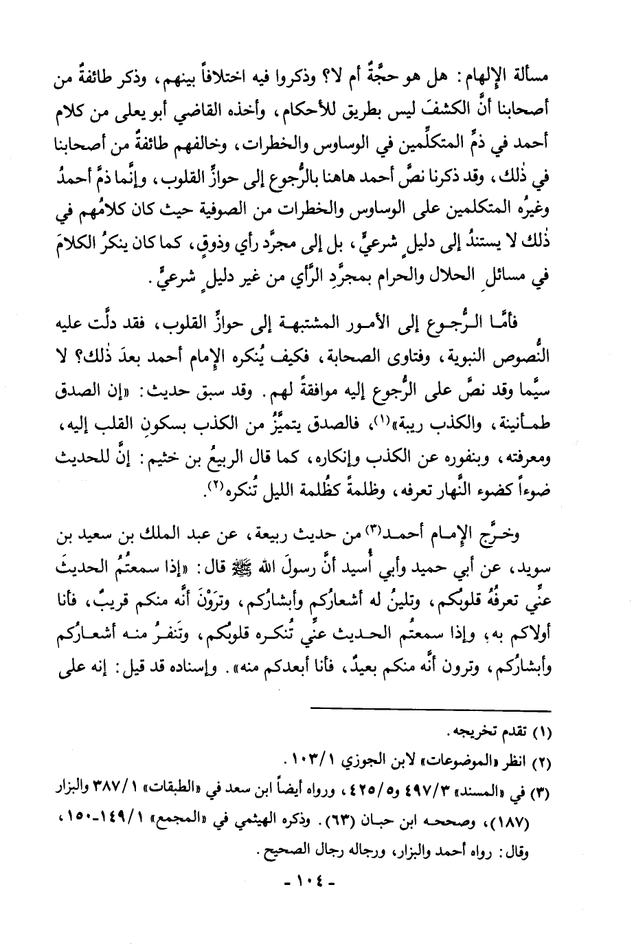 فَأَمَّا الرُّجُوعُ إِلَى الْأُمُورِ الْمُشْتَبِهَةِ إِلَى حَوَازِّ الْقُلُوبِ، فَقَدْ دَلَّتْ عَلَيْهِ النُّصُوصُ النَّبَوِيَّةُ، وَفَتَاوَى الصَّحَابَةِ، فَكَيْفَ يُنْكِرُهُ الْإِمَامُ أَحْمَدُ بَعْدَ ذَلِكَ؟ لَا سِيَّمَا وَقَدْ نَصَّ عَلَى الرُّجُوعِ إِلَيْهِ مُوَافَقَةً لَهُمْ. وَقَدْ سَبَقَ حَدِيثُ: «إِنَّ الصِّدْقَ طُمَأْنِينَةٌ، وَالْكَذِبَ رِيبَةٌ» ، فَالصِّدْقُ يَتَمَيَّزُ مِنَ الْكَذِبِ بِسُكُونِ الْقَلْبِ إِلَيْهِ، وَمَعْرِفَتِهِ، وَبِنُفُورِهِ عَنِ الْكَذِبِ وَإِنْكَارِهِ، كَمَا قَالَ الرَّبِيعُ بْنُ خُثَيْمٍ: إِنَّ لِلْحَدِيثِ ضَوْءًا كَضَوْءِ النَّهَارِ تَعْرِفُهُ، وَظُلْمَةً كَظُلْمَةِ اللَّيْلِ تُنْكِرُهُ.