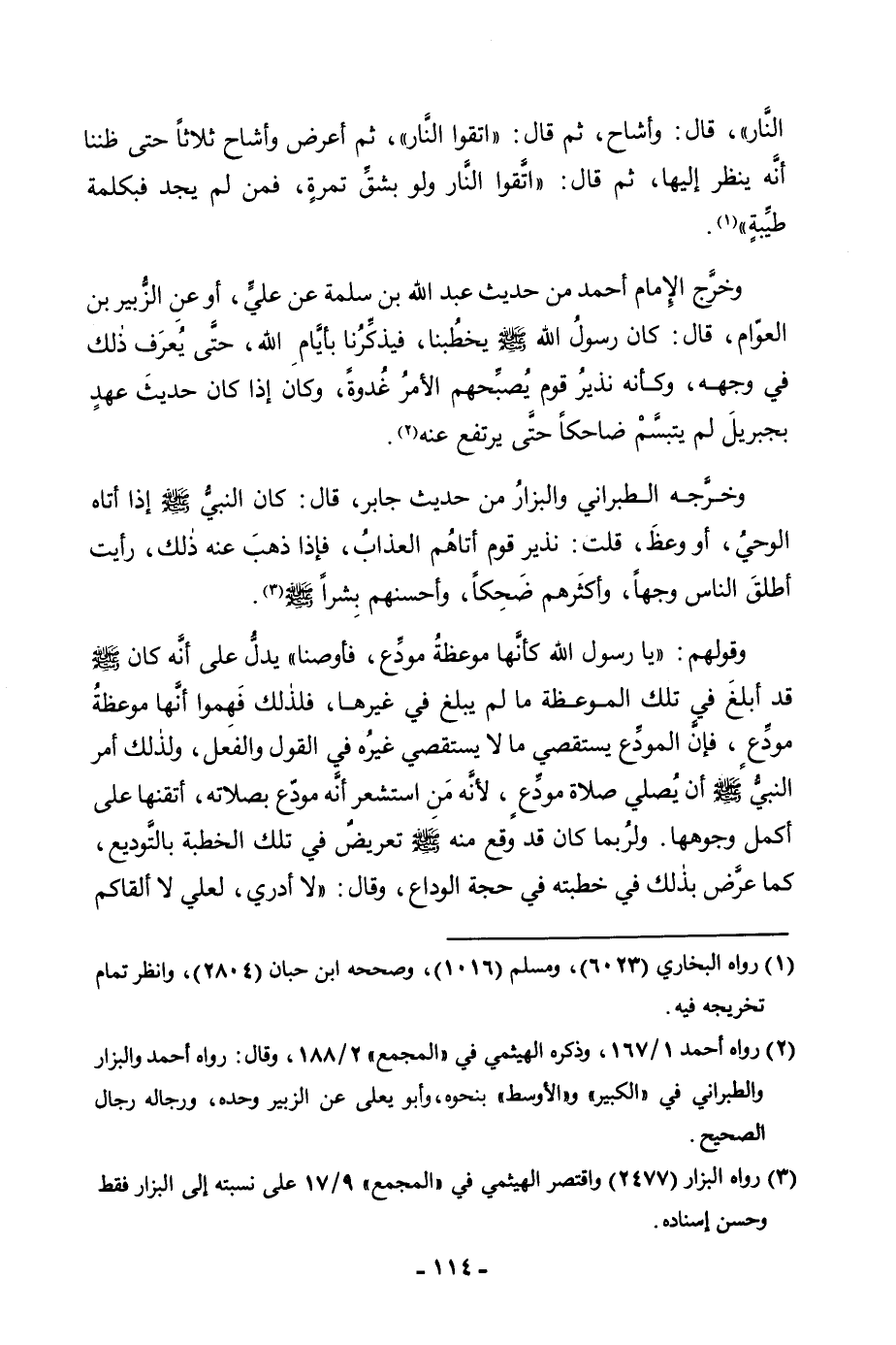 وَخَرَّجَهُ الْإِمَامُ أَحْمَدُ مِنْ حَدِيثِ عَبْدِ اللَّهِ بْنِ سَلَمَةَ عَنْ عَلِيٍّ، أَوْ عَنِ الزُّبَيْرِ بْنِ الْعَوَّامِ، قَالَ: «كَانَ رَسُولُ اللَّهِ صَلَّى اللَّهُ عَلَيْهِ وَسَلَّمَ يَخْطُبُنَا، فَيُذَكِّرُنَا بِأَيَّامِ اللَّهِ، حَتَّى يُعْرَفَ ذَلِكَ فِي وَجْهِهِ، وَكَأَنَّهُ نَذِيرُ قَوْمٍ يُصَبِّحُهُمُ الْأَمْرُ غُدْوَةً، وَكَانَ إِذَا كَانَ حَدِيثَ عَهْدٍ بِجِبْرِيلَ لَمْ يَتَبَسَّمْ ضَاحِكًا حَتَّى يَرْتَفِعَ عَنْهُ» .