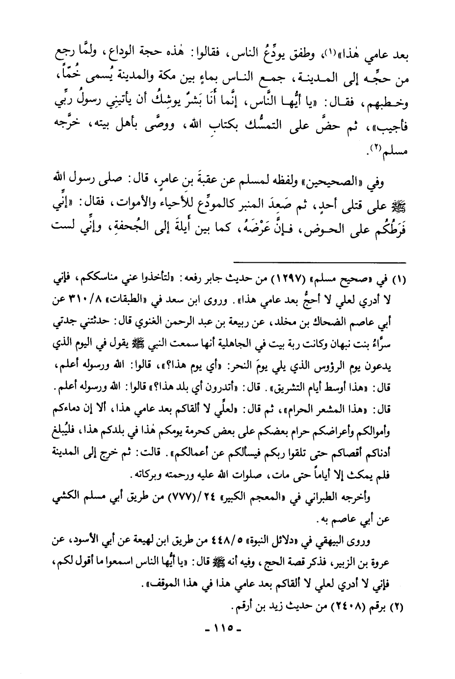 بَعْدَ عَامِي هَذَا وَطَفِقَ يُوَدِّعُ النَّاسَ، فَقَالُوا: هَذِهِ حَجَّةُ الْوَدَاعِ، وَلَمَّا رَجَعَ مِنْ حَجِّهِ إِلَى الْمَدِينَةِ، جَمَعَ النَّاسَ بِمَاءٍ بَيْنَ مَكَّةَ وَالْمَدِينَةِ يُسَمَّى خُمًّا، وَخَطَبَهُمْ، وَقَالَ: يَا أَيُّهَا النَّاسُ، إِنَّمَا أَنَا بَشَرٌ مِثْلُكُمْ يُوشِكُ أَنْ يَأْتِيَنِي رَسُولُ رَبِّي فَأُجِيبَ ثُمَّ حَضَّ عَلَى التَّمَسُّكِ بِكِتَابِ اللَّهِ، وَوَصَّى بِأَهْلِ بَيْتِهِ» ، خَرَّجَهُ مُسْلِمٌ.