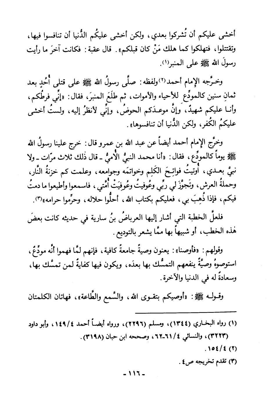 وَخَرَّجَ» الْإِمَامُ أَحْمَدُ وَلَفْظُهُ: «صَلَّى رَسُولُ اللَّهِ صَلَّى اللَّهُ عَلَيْهِ وَسَلَّمَ عَلَى قَتْلَى أُحُدٍ بَعْدَ ثَمَانِ سِنِينَ كَالْمُوَدِّعِ لِلْأَحْيَاءِ وَالْأَمْوَاتِ، ثُمَّ طَلَعَ الْمِنْبَرَ، فَقَالَ: إِنِّي فَرَطُكُمْ، وَأَنَا عَلَيْكُمْ شَهِيدٌ، وَإِنَّ مَوْعِدَكُمُ الْحَوْضُ، وَإِنِّي لَأَنْظُرُ إِلَيْهِ، وَلَسْتُ أَخْشَى عَلَيْكُمُ الْكُفْرَ، وَلَكِنِ الدُّنْيَا أَنْ تَنَافَسُوهَا» .
