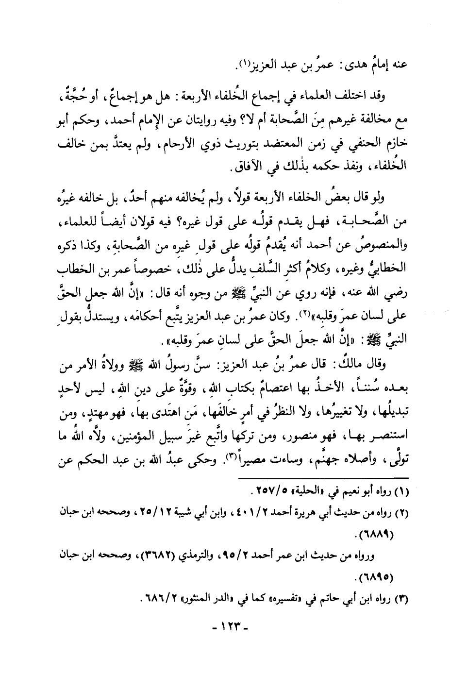وَقَالَ مَالِكٌ: قَالَ عُمَرُ بْنُ عَبْدِ الْعَزِيزِ: سَنَّ رَسُولُ اللَّهِ صَلَّى اللَّهُ عَلَيْهِ وَسَلَّمَ وَوُلَاةُ الْأَمْرِ مِنْ بَعْدِهِ سُنَنًا، الْأَخْذُ بِهَا اعْتِصَامٌ بِكِتَابِ اللَّهِ، وَقُوَّةٌ عَلَى دِينِ اللَّهِ، وَلَيْسَ لِأَحَدٍ تَبْدِيلُهَا، وَلَا تَغْيِيرُهَا، وَلَا النَّظَرُ فِي أَمْرٍ خَالَفَهَا، مَنِ اهْتَدَى بِهَا فَهُوَ مُهْتَدٍ، وَمَنِ اسْتَنْصَرَ بِهَا فَهُوَ مَنْصُورٌ، وَمَنْ تَرَكَهَا وَاتَّبَعَ غَيْرَ سَبِيلِ الْمُؤْمِنِينَ، وَلَّاهُ اللَّهُ مَا تَوَلَّى وَأَصْلَاهُ جَهَنَّمَ، وَسَاءَتْ مَصِيرًا. وَحَكَى عَبْدُ اللَّهِ بْنُ عَبْدِ الْحَكَمِ عَنْ