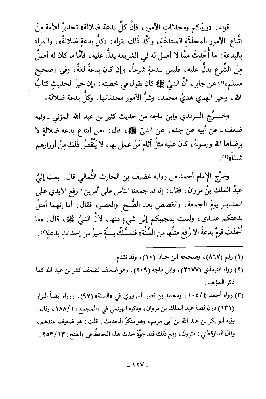 وَخَرَّجَ الْإِمَامُ أَحْمَدُ مِنْ رِوَايَةِ غُضَيْفِ بْنِ الْحَارِثِ الثُّمَالِي قَالَ: بَعَثَ إِلَيَّ عَبْدُ الْمَلِكِ بْنُ مَرْوَانَ، فَقَالَ: إِنَّا قَدْ جَمَعْنَا النَّاسَ عَلَى أَمْرَيْنِ: رَفْعِ الْأَيْدِي عَلَى الْمَنَابِرِ يَوْمَ الْجُمُعَةَ، وَالْقَصَصِ بَعْدَ الصُّبْحِ وَالْعَصْرِ، فَقَالَ: أَمَا إِنَّهُمَا أَمْثَلُ بِدْعَتِكُمْ عِنْدِي، وَلَسْتُ بِمُجِيبِكُمْ إِلَى شَيْءٍ مِنْهَا، لِأَنَّ النَّبِيَّ صَلَّى اللَّهُ عَلَيْهِ وَسَلَّمَ، قَالَ: «مَا أَحْدَثَ قَوْمٌ بِدْعَةً إِلَّا رُفِعَ مِثْلُهَا مِنَ السُّنَّةِ» فَتَمَسُّكٌ بِسُنَّةٍ خَيْرٌ مِنْ إِحْدَاثِ بِدَعَةٍ.