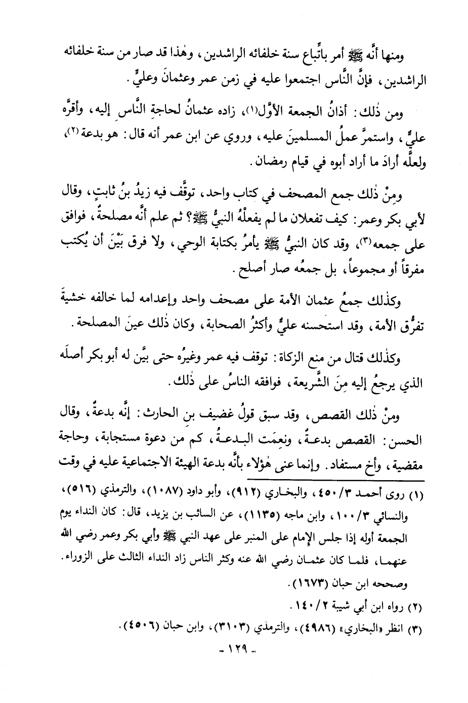وَمِنْ ذَلِكَ جَمْعُ الْمُصْحَفِ فِي كِتَابٍ وَاحِدٍ، تَوَقَّفَ فِيهِ زَيْدُ بْنُ ثَابِتٍ وَقَالَ لِأَبِي بَكْرٍ وَعُمَرَ: كَيْفَ تَفْعَلَانِ مَا لَمْ يَفْعَلْهُ النَّبِيُّ صَلَّى اللَّهُ عَلَيْهِ وَسَلَّمَ؟ ثُمَّ عَلِمَ أَنَّهُ مَصْلَحَةٌ، فَوَافَقَ عَلَى جَمْعِهِ، وَقَدْ كَانَ النَّبِيُّ صَلَّى اللَّهُ عَلَيْهِ وَسَلَّمَ يَأْمُرُ بِكِتَابَةِ الْوَحْيِ، وَلَا فَرْقَ بَيْنَ أَنْ يُكْتَبَ مُفَرَّقًا أَوْ مَجْمُوعًا، بَلْ جَمْعُهُ صَارَ أَصْلَحَ.