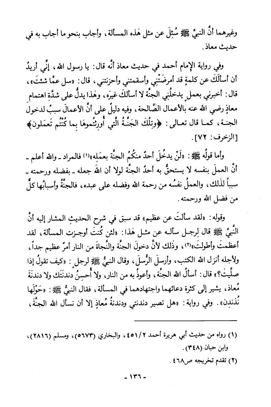 وَفِي رِوَايَةِ الْإِمَامِ أَحْمَدَ فِي «حَدِيثِ مُعَاذٍ أَنَّهُ قَالَ: يَا رَسُولَ اللَّهِ، إِنِّي أُرِيدُ أَنْ أَسْأَلَكَ عَنْ كَلِمَةٍ قَدْ أَمْرَضَتْنِي وَأَسْقَمَتْنِي وَأَحْزَنَتْنِي، قَالَ: سَلْ عَمَّا شِئْتَ، قَالَ: أَخْبِرْنِي بِعَمَلٍ يُدْخِلُنِي الْجَنَّةَ لَا أَسْأَلُكَ غَيْرَهُ» ، وَهَذَا يَدُلُّ عَلَى شِدَّةِ اهْتِمَامِ مُعَاذٍ رَضِيَ اللَّهُ عَنْهُ بِالْأَعْمَالِ الصَّالِحَةِ، وَفِيهِ دَلِيلٌ عَلَى أَنَّ الْأَعْمَالَ سَبَبٌ لِدُخُولِ الْجَنَّةِ، كَمَا قَالَ تَعَالَى: {وَتِلْكَ الْجَنَّةُ الَّتِي أُورِثْتُمُوهَا بِمَا كُنْتُمْ تَعْمَلُونَ} [الزخرف: 72] [الزُّخْرُفِ: 72] .