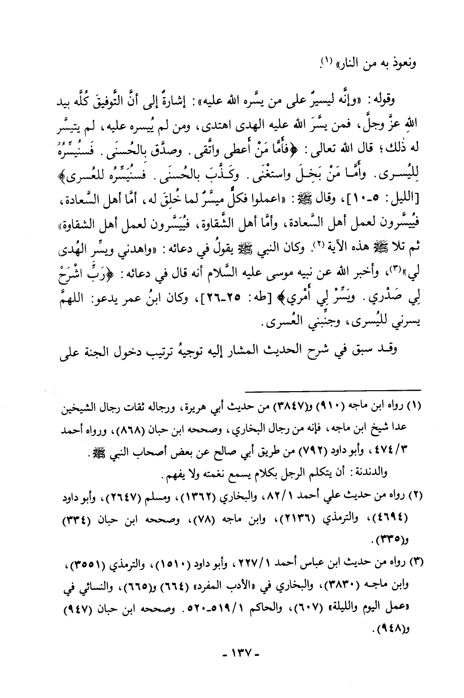 وَقَوْلُهُ: وَإِنَّهُ لَيَسِيرٌ عَلَى مَنْ يَسَّرَهُ اللَّهُ عَلَيْهِ: إِشَارَةٌ إِلَى أَنَّ التَّوْفِيقَ كُلَّهُ بِيَدِ اللَّهِ عَزَّ وَجَلَّ، فَمَنْ يَسَّرَ اللَّهُ عَلَيْهِ الْهُدَى اهْتَدَى، وَمَنْ لَمْ يُيَسِّرْهُ عَلَيْهِ، لَمْ يُيَسَّرْ لَهُ ذَلِكَ؛ قَالَ اللَّهُ تَعَالَى: {فَأَمَّا مَنْ أَعْطَى وَاتَّقَى - وَصَدَّقَ بِالْحُسْنَى - فَسَنُيَسِّرُهُ لِلْيُسْرَى - وَأَمَّا مَنْ بَخِلَ وَاسْتَغْنَى - وَكَذَّبَ بِالْحُسْنَى - فَسَنُيَسِّرُهُ لِلْعُسْرَى} [الليل: 5 - 10] [اللَّيْلِ: 5 - 10] ، «وَقَالَ صَلَّى اللَّهُ عَلَيْهِ وَسَلَّمَ: اعْمَلُوا فَكُلٌّ مُيَسَّرٌ لِمَا خُلِقَ لَهُ، أَمَّا أَهْلُ السَّعَادَةِ فَيُيَسَّرُونَ لِعَمَلِ أَهْلِ السَّعَادَةِ، وَأَمَّا أَهْلُ الشَّقَاوَةِ فَيُيَسَّرُونَ لِعَمَلِ أَهْلِ الشَّقَاوَةِ، ثُمَّ تَلَا صَلَّى اللَّهُ عَلَيْهِ وَسَلَّمَ هَذِهِ الْآيَةَ» . «وَكَانَ النَّبِيُّ صَلَّى اللَّهُ عَلَيْهِ وَسَلَّمَ يَقُولُ فِي دُعَائِهِ: وَاهْدِنِي وَيَسِّرِ الْهُدَى لِي» ، وَأَخْبَرَ اللَّهُ عَنْ نَبِيِّهِ مُوسَى عَلَيْهِ السَّلَامُ أَنَّهُ قَالَ فِي دُعَائِهِ: {رَبِّ اشْرَحْ لِي صَدْرِي - وَيَسِّرْ لِي أَمْرِي} [طه: 25 - 26] [طه: 25 - 26] ، وَكَانَ ابْنُ عُمَرَ يَدْعُو: اللَّهُمَّ يَسِّرْنِي لِلْيُسْرَى، وَجَنِّبْنِي الْعُسْرَى.