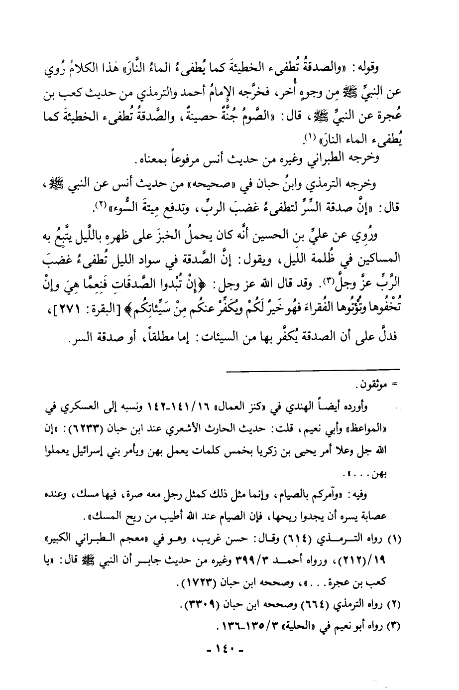 وَقَوْلُهُ: «وَالصَّدَقَةُ تُطْفِئُ الْخَطِيئَةَ كَمَا يُطْفِئُ الْمَاءُ النَّارَ» هَذَا الْكَلَامُ رُوِيَ عَنِ النَّبِيِّ صَلَّى اللَّهُ عَلَيْهِ وَسَلَّمَ مِنْ وُجُوهٍ أُخَرَ، فَخَرَّجَهُ الْإِمَامُ أَحْمَدُ وَالتِّرْمِذِيُّ مِنْ حَدِيثِ كَعْبِ بْنِ عُجْرَةَ عَنِ النَّبِيِّ صَلَّى اللَّهُ عَلَيْهِ وَسَلَّمَ، قَالَ: «الصَّوْمُ جُنَّةٌ حَصِينَةٌ، وَالصَّدَقَةُ تُطْفِئُ الْخَطِيئَةَ كَمَا يُطْفِئُ الْمَاءُ النَّارَ» .