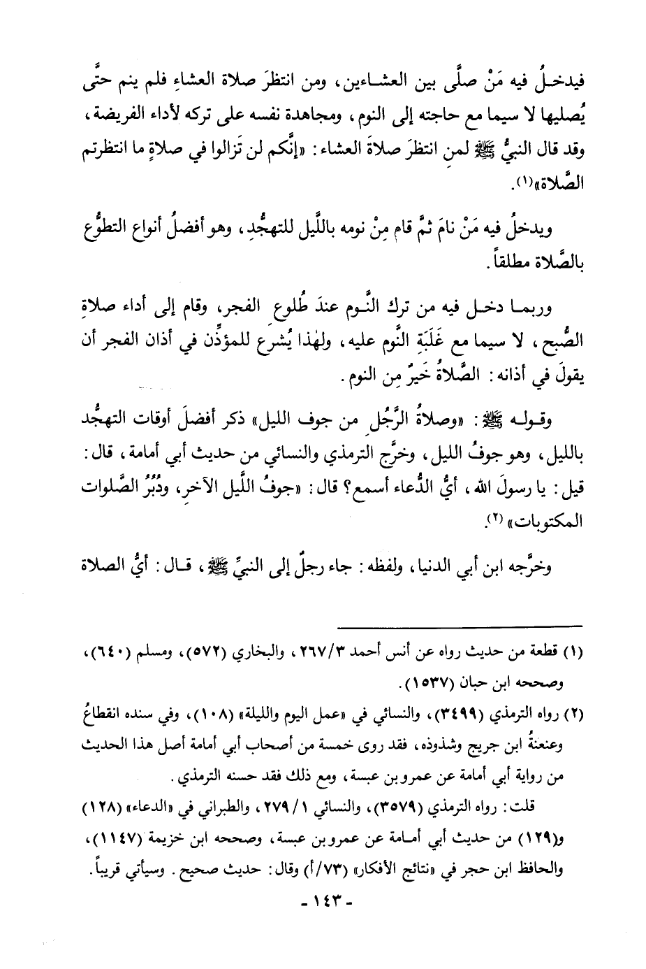 وَقَوْلُهُ صَلَّى اللَّهُ عَلَيْهِ وَسَلَّمَ: «وَصَلَاةُ الرَّجُلِ فِي جَوْفِ اللَّيْلِ» ذَكَرَ أَفْضَلَ أَوْقَاتِ التَّهَجُّدِ بِاللَّيْلِ، وَهُوَ جَوْفُ اللَّيْلِ، وَخَرَّجَ التِّرْمِذِيُّ وَالنَّسَائِيُّ مِنْ حَدِيثِ أَبِي أُمَامَةَ، قَالَ: «قِيلَ: يَا رَسُولَ اللَّهِ، أَيُّ الدُّعَاءِ أَسْمَعُ؟ قَالَ: جَوْفُ اللَّيْلِ الْآخِرُ، وَدُبُرُ الصَّلَوَاتِ الْمَكْتُوبَاتِ» .