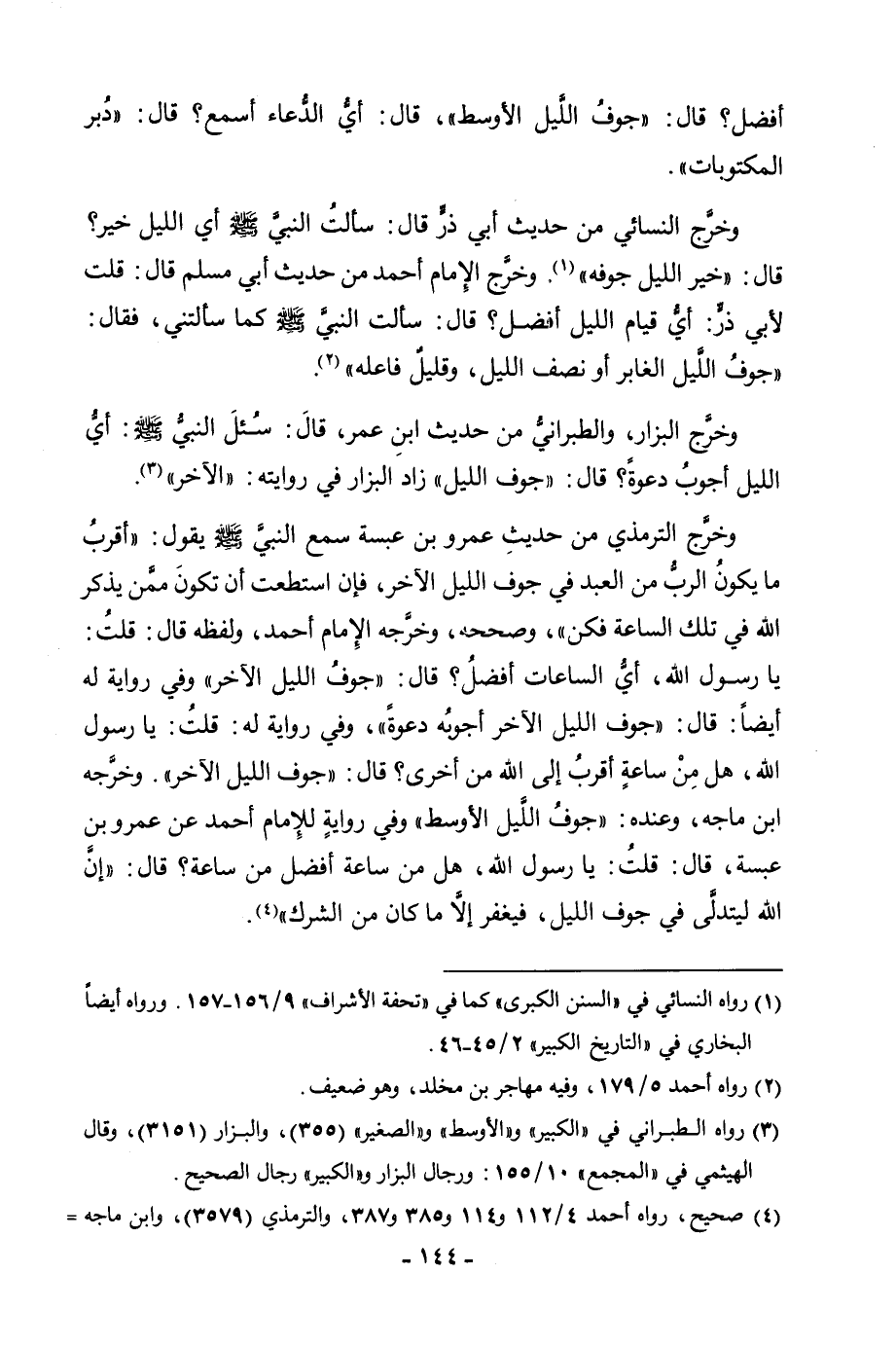 وَخَرَّجَ التِّرْمِذِيُّ مِنْ حَدِيثِ عَمْرِو بْنِ عَبَسَةَ سَمِعَ النَّبِيَّ صَلَّى اللَّهُ عَلَيْهِ وَسَلَّمَ يَقُولُ: «أَقْرَبُ مَا يَكُونُ الرَّبُّ مِنَ الْعَبْدِ فِي جَوْفِ اللَّيْلِ الْآخِرِ، فَإِنِ اسْتَطَعْتَ أَنْ تَكُونَ مِمَّنْ يَذْكُرُ اللَّهَ تِلْكَ السَّاعَةَ فَكُنْ» ، وَصَحَّحَهُ، وَخَرَّجَهُ الْإِمَامُ أَحْمَدُ، وَلَفْظُهُ قَالَ: «قُلْتُ: يَا رَسُولَ اللَّهِ، أَيُّ السَّاعَاتِ أَفْضَلُ؟ قَالَ: جَوْفُ اللَّيْلِ الْآخِرُ وَفِي رِوَايَةٍ لَهُ أَيْضًا: قَالَ: جَوْفُ اللَّيْلِ الْآخِرُ أَجْوَبُهُ دَعْوَةً، وَفِي رِوَايَةٍ لَهُ: قُلْتُ: يَا رَسُولَ اللَّهِ، هَلْ مِنْ سَاعَةٍ أَقْرَبُ إِلَى اللَّهِ مِنْ أُخْرَى؟ قَالَ: جَوْفُ اللَّيْلِ الْآخِرُ» . وَخَرَّجَهُ ابْنُ مَاجَهْ، وَعِنْدَهُ: جَوْفُ اللَّيْلِ الْأَوْسَطُ وَفِي رِوَايَةِ الْإِمَامِ أَحْمَدَ عَنْ عَمْرِو بْنِ عَبَسَةَ، قَالَ: «قُلْتُ: يَا رَسُولَ اللَّهِ، هَلْ مِنْ سَاعَةٍ أَفْضَلُ مِنْ سَاعَةٍ؟ قَالَ: إِنَّ اللَّهَ لَيَتَدَلَّى فِي جَوْفِ اللَّيْلِ، فَيَغْفِرُ إِلَّا مَا كَانَ مِنَ الشِّرْكِ» .