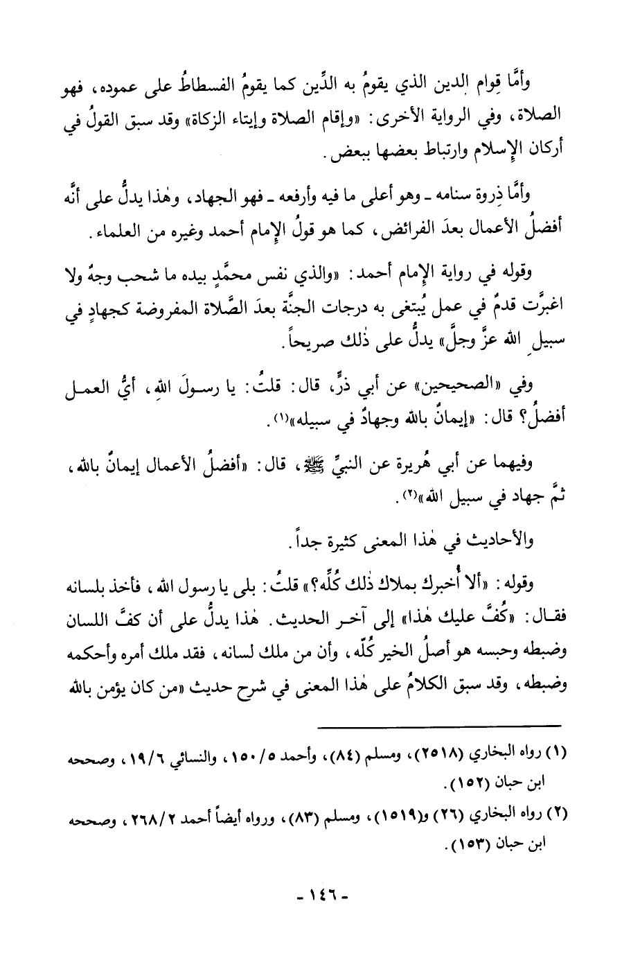 وَقَوْلُهُ فِي رِوَايَةِ الْإِمَامِ أَحْمَدَ: «وَالَّذِي نَفْسُ مُحَمَّدٍ بِيَدِهِ مَا شَحَبَ وَجْهٌ وَلَا اغْبَرَّتْ قَدَمٌ فِي عَمَلٍ يُبْتَغَى بِهِ دَرَجَاتُ الْجَنَّةِ بَعْدَ الصَّلَاةِ الْمَفْرُوضَةِ كَجِهَادٍ فِي سَبِيلِ اللَّهِ عَزَّ وَجَلَّ» يَدُلُّ عَلَى ذَلِكَ صَرِيحًا.