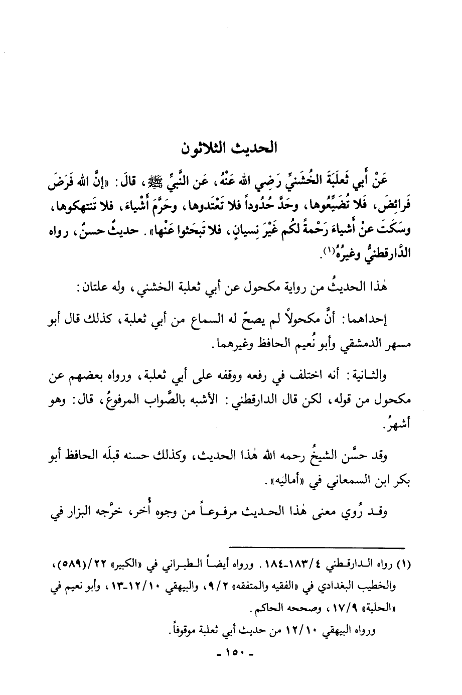 «عَنْ أَبِي ثَعْلَبَةَ الْخُشَنِيِّ رَضِيَ اللَّهُ عَنْهُ، عَنْ رَسُولِ اللَّهِ صَلَّى اللَّهُ عَلَيْهِ وَسَلَّمَ، قَالَ: إِنَّ اللَّهَ فَرَضَ فَرَائِضَ، فَلَا تُضَيِّعُوهَا، وَحَدَّ حُدُودًا فَلَا تَعْتَدُوهَا، وَحَرَّمَ أَشْيَاءَ، فَلَا تَنْتَهِكُوهَا، وَسَكَتَ عَنْ أَشْيَاءَ رَحْمَةً لَكُمْ غَيْرَ نِسْيَانٍ، فَلَا تَبْحَثُوا عَنْهَا» . حَدِيثٌ حَسَنٌ، رَوَاهُ الدَّارَقُطْنِيُّ وَغَيْرُهُ.