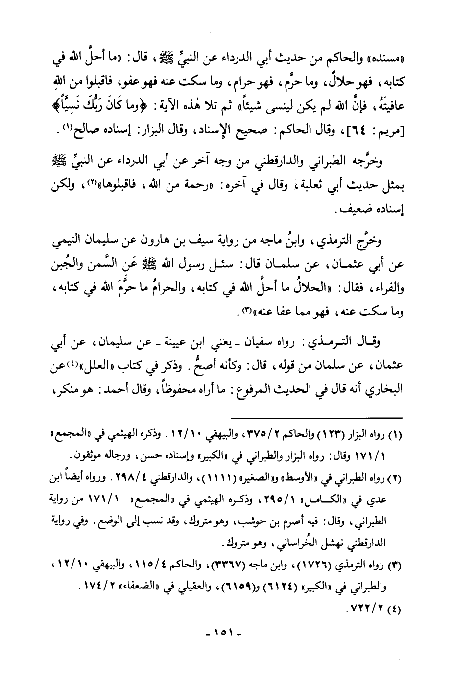 " مُسْنَدِهِ " وَالْحَاكِمُ مِنْ حَدِيثِ أَبِي الدَّرْدَاءِ عَنِ النَّبِيِّ صَلَّى اللَّهُ عَلَيْهِ وَسَلَّمَ، قَالَ: «مَا أَحَلَّ اللَّهُ فِي كِتَابِهِ فَهُوَ حَلَالٌ، وَمَا حَرَّمَ فَهُوَ حَرَامٌ، وَمَا سَكَتَ عَنْهُ فَهُوَ عَفْوٌ، فَاقْبَلُوا مِنَ اللَّهِ عَافِيَتَهُ، فَإِنَّ اللَّهَ لَمْ يَكُنْ لِيَنْسَى شَيْئًا ثُمَّ تَلَا هَذِهِ الْآيَةَ: {وَمَا كَانَ رَبُّكَ نَسِيًّا} [مريم: 64] » [مَرْيَمَ: 64] ، وَقَالَ الْحَاكِمُ: صَحِيحُ الْإِسْنَادِ، وَقَالَ الْبَزَّارُ: إِسْنَادُهُ صَالِحٌ.