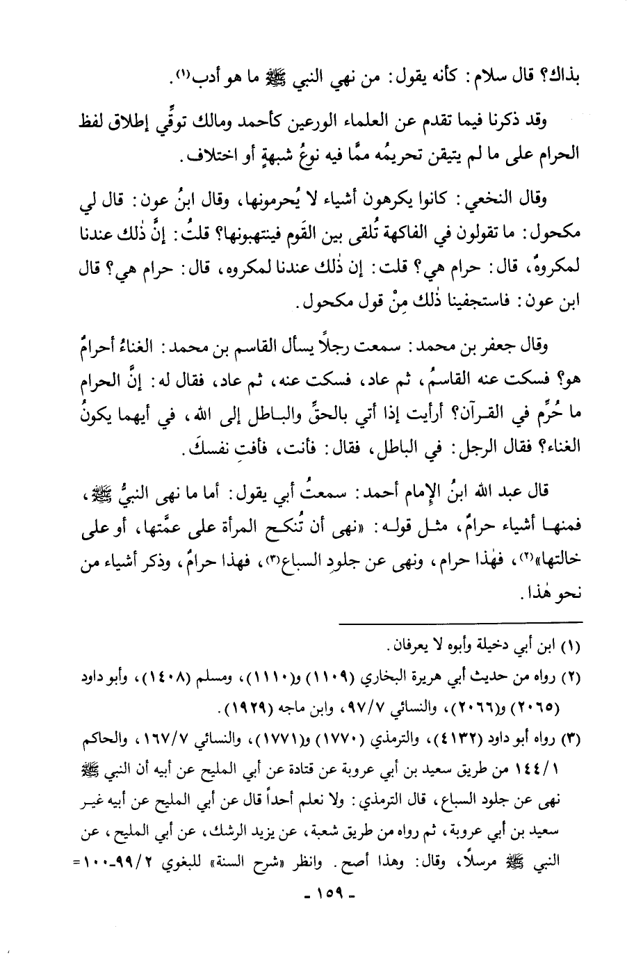 قَالَ عَبْدُ اللَّهِ ابْنُ الْإِمَامِ أَحْمَدَ: سَمِعْتُ أَبِي يَقُولُ: أَمَّا مَا نَهَى النَّبِيُّ صَلَّى اللَّهُ عَلَيْهِ وَسَلَّمَ، فَمِنْهَا أَشْيَاءُ حَرَامٌ، مِثْلَ قَوْلِهِ: «نَهَى أَنْ تُنْكَحَ الْمَرْأَةُ عَلَى عَمَّتِهَا، أَوْ عَلَى خَالَتِهَا» فَهَذَا حَرَامٌ، «وَنَهَى عَنْ جُلُودِ السِّبَاعِ» ، فَهَذَا حَرَامٌ، وَذَكَرَ أَشْيَاءَ مِنْ نَحْوِ هَذَا.
