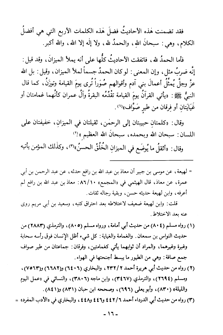 فَقَدْ تَضَمَّنَتْ هَذِهِ الْأَحَادِيثُ فَضْلَ هَذِهِ الْكَلِمَاتِ الْأَرْبَعِ الَّتِي هِيَ أَفْضَلُ الْكَلَامِ، وَهِيَ سُبْحَانَ اللَّهِ، وَالْحَمْدُ لِلَّهِ، وَلَا إِلَهَ إِلَّا اللَّهُ، وَاللَّهُ أَكْبَرُ. فَأَمَّا الْحَمْدُ لِلَّهِ، فَاتَّفَقَتِ الْأَحَادِيثُ كُلُّهَا عَلَى أَنَّهُ يَمْلَأُ الْمِيزَانَ، وَقَدْ قِيلَ: إِنَّهُ ضَرْبُ مَثَلٍ، وَإِنَّ الْمَعْنَى: لَوْ كَانَ الْحَمْدُ جِسْمًا لَمَلَأَ الْمِيزَانَ، وَقِيلَ: بَلِ اللَّهُ عَزَّ وَجَلَّ يُمَثِّلُ أَعْمَالَ بَنِي آدَمَ وَأَقْوَالَهُمْ صُوَرًا تُرَى يَوْمَ الْقِيَامَةِ وَتُوزَنُ، كَمَا قَالَ النَّبِيُّ صَلَّى اللَّهُ عَلَيْهِ وَسَلَّمَ: «يَأْتِي الْقُرْآنُ يَوْمَ الْقِيَامَةِ تَقْدُمُهُ الْبَقَرَةُ وَآلُ عِمْرَانَ كَأَنَّهُمَا غَمَامَتَانِ أَوْ غَيَايَتَانِ أَوْ فِرْقَانِ مِنْ طَيْرٍ صَوَافَّ» . وَقَالَ: " «كَلِمَتَانِ حَبِيبَتَانِ إِلَى الرَّحْمَنِ، ثَقِيلَتَانِ فِي الْمِيزَانِ، خَفِيفَتَانِ عَلَى اللِّسَانِ: سُبْحَانَ اللَّهِ وَبِحَمْدِهِ، سُبْحَانَ اللَّهِ الْعَظِيمِ» . وَقَالَ: «أَثْقَلُ مَا يُوضَعُ فِي الْمِيزَانِ الْخُلُقُ الْحَسَنُ» ، وَكَذَلِكَ الْمُؤْمِنُ يَأْتِيهِ