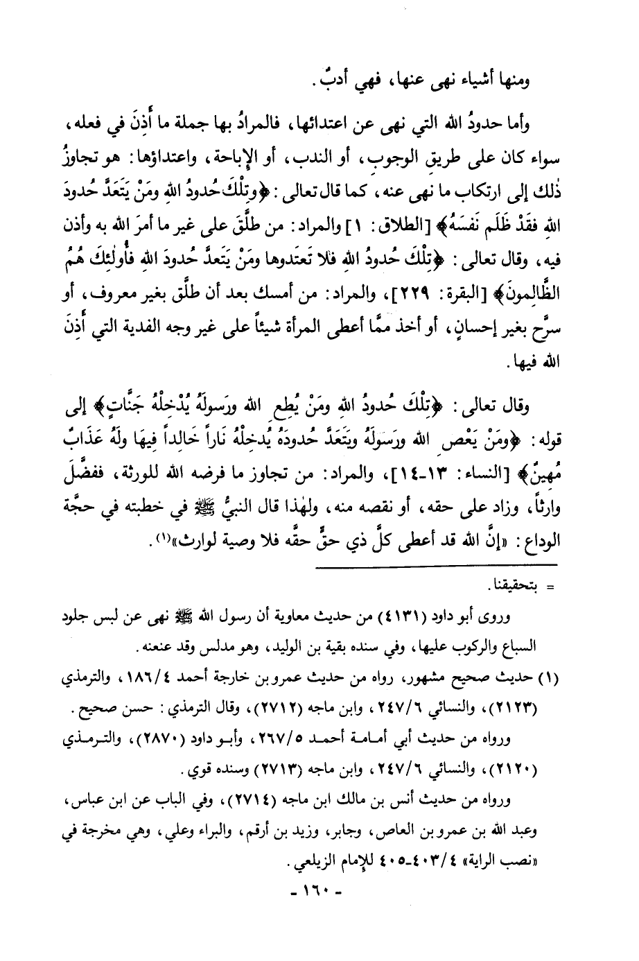 وَقَالَ تَعَالَى: {تِلْكَ حُدُودُ اللَّهِ وَمَنْ يُطِعِ اللَّهَ وَرَسُولَهُ يُدْخِلْهُ جَنَّاتٍ} [النساء: 13] إِلَى قَوْلِهِ: {وَمَنْ يَعْصِ اللَّهَ وَرَسُولَهُ وَيَتَعَدَّ حُدُودَهُ يُدْخِلْهُ نَارًا خَالِدًا فِيهَا وَلَهُ عَذَابٌ مُهِينٌ} [النساء: 14] [النِّسَاءِ: 13 - 14] ، وَالْمُرَادُ مِنْ تَجَاوُزِ مَا فَرَضَهُ اللَّهُ لِلْوَرَثَةِ، فَفَضَّلَ وَارِثًا، وَزَادَ عَلَى حَقِّهِ، أَوْ نَقَصَهُ مِنْهُ، وَلِهَذَا «قَالَ النَّبِيُّ صَلَّى اللَّهُ عَلَيْهِ وَسَلَّمَ فِي خُطْبَتِهِ فِي حَجَّةِ الْوَدَاعِ: إِنَّ اللَّهَ أَعْطَى كُلَّ ذِي حَقِّ حَقَّهُ فَلَا وَصِيَّةَ لِوَارِثٍ» .