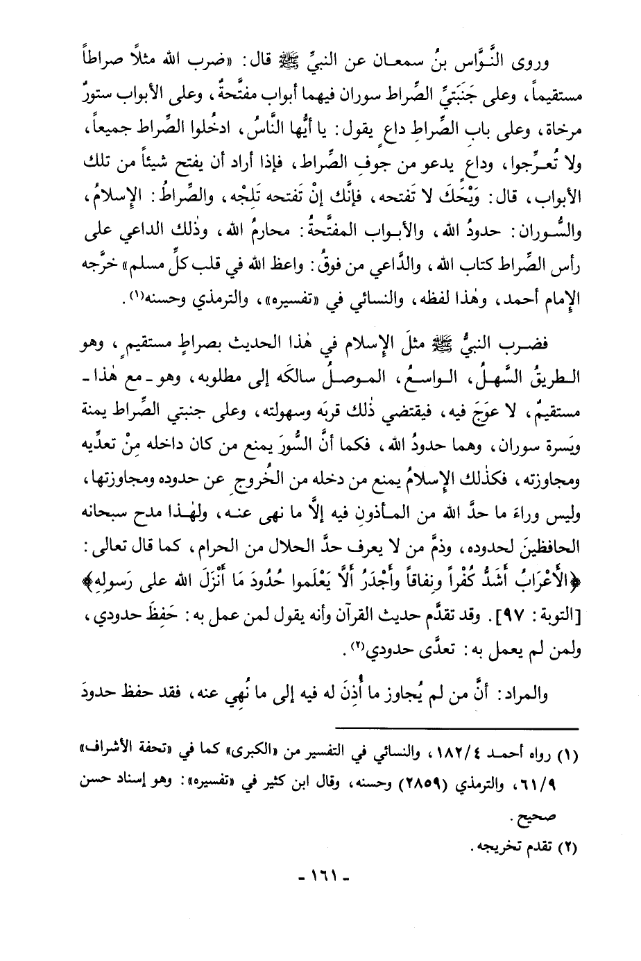 وَرَوَى النَّوَّاسُ بْنُ سَمْعَانَ عَنِ النَّبِيِّ صَلَّى اللَّهُ عَلَيْهِ وَسَلَّمَ قَالَ: «ضَرَبَ اللَّهُ مَثَلًا صِرَاطًا مُسْتَقِيمًا، وَعَلَى جَنَبَتَيِ الصِّرَاطِ سُورَانِ فِيهِمَا أَبْوَابٌ مُفَتَّحَةٌ، وَعَلَى الْأَبْوَابِ سُتُورٌ مُرْخَاةٌ، وَعَلَى بَابِ الصِّرَاطِ دَاعٍ يَقُولُ: يَا أَيُّهَا النَّاسُ، ادْخُلُوا الصِّرَاطَ جَمِيعًا، وَلَا تَعْرُجُوا، وَدَاعٍ يَدْعُو مِنْ جَوْفِ الصِّرَاطِ، فَإِذَا أَرَادَ أَنْ يَفْتَحَ شَيْئًا مِنْ تِلْكَ الْأَبْوَابِ، قَالَ: وَيْحَكَ لَا تَفْتَحْهُ، فَإِنَّكَ إِنْ تَفْتَحْهُ تَلِجْهُ، وَالصِّرَاطُ: الْإِسْلَامُ، وَالسُّورَانِ: حُدُودُ اللَّهِ، وَالْأَبْوَابُ الْمُفَتَّحَةُ: مَحَارِمُ اللَّهِ، وَذَلِكَ الدَّاعِي عَلَى رَأْسِ الصِّرَاطِ كِتَابُ اللَّهِ، وَالدَّاعِي مِنْ فَوْقَ وَاعِظُ اللَّهِ فِي قَلْبِ كُلِّ مُسْلِمٍ» خَرَّجَهُ الْإِمَامُ أَحْمَدُ، وَهَذَا لَفْظُهُ، وَالنَّسَائِيُّ فِي " تَفْسِيرِهِ " وَالتِّرْمِذِيُّ وَحَسَّنَهُ.