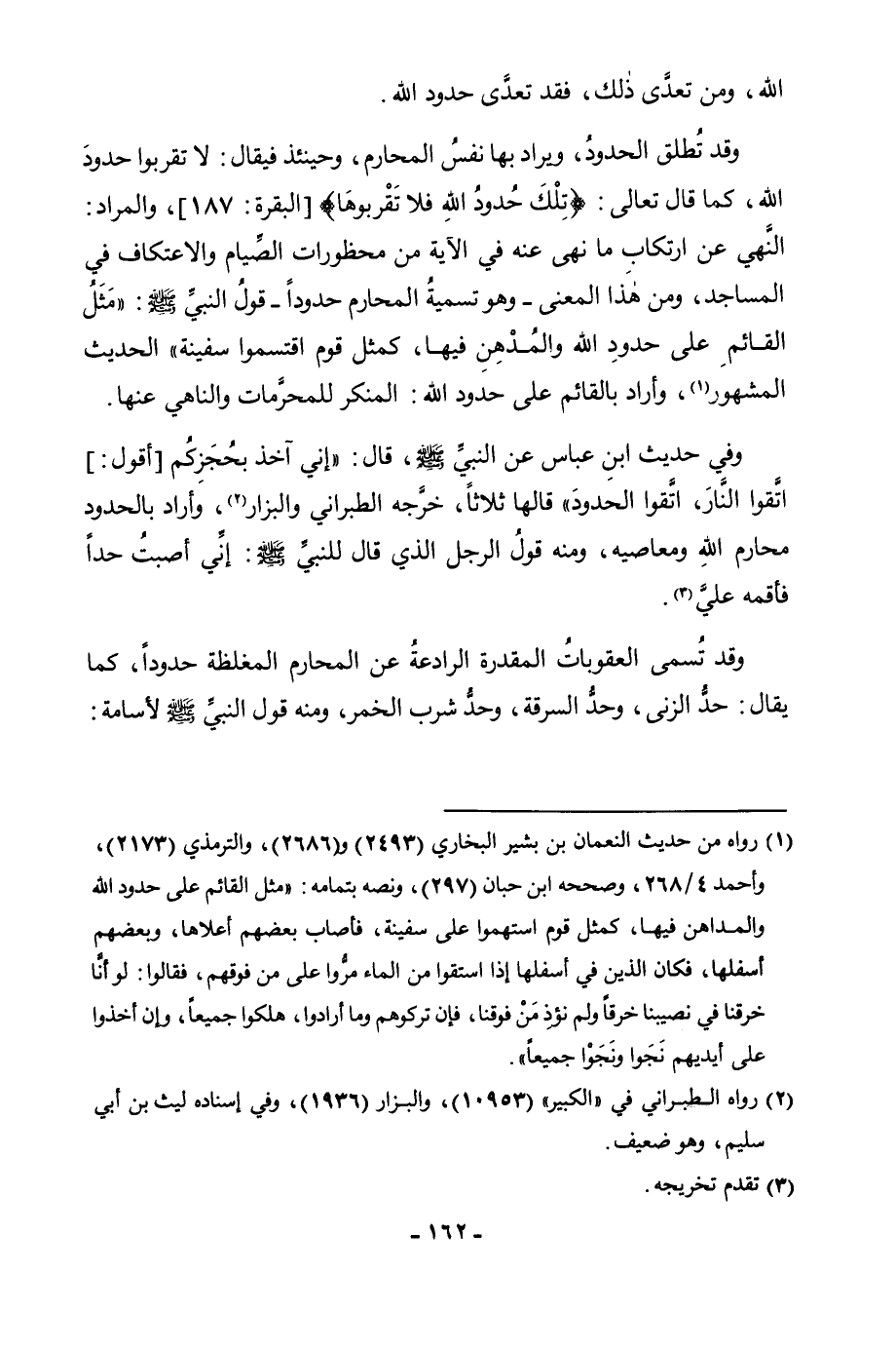 وَفِي حَدِيثِ ابْنِ عَبَّاسٍ عَنِ النَّبِيِّ صَلَّى اللَّهُ عَلَيْهِ وَسَلَّمَ قَالَ: «إِنِّي آخِذٌ بِحُجَزِكُمْ [أَقُولُ:] اتَّقُوا النَّارَ، اتَّقُوا الْحُدُودَ قَالَهَا ثَلَاثًا» ، خَرَّجَهُ الطَّبَرَانِيُّ وَالْبَزَّارُ، وَأَرَادَ بِالْحُدُودِ مَحَارِمَ اللَّهِ وَمَعَاصِيَهُ، وَمِنْهُ «قَوْلُ الرَّجُلِ الَّذِي قَالَ لِلنَّبِيِّ صَلَّى اللَّهُ عَلَيْهِ وَسَلَّمَ: فَإِنِّي أَصَبْتُ حَدًّا فَأَقِمْهُ عَلَيَّ» .