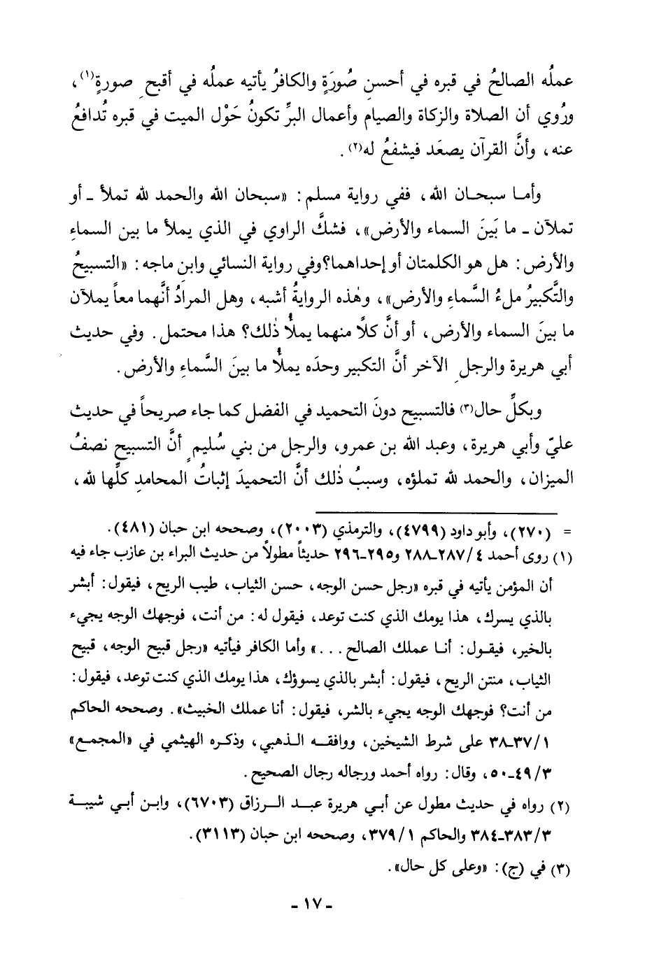 عَمَلُهُ الصَّالِحُ فِي قَبْرِهِ فِي أَحْسَنِ صُورَةٍ وَالْكَافِرُ يَأْتِيهِ عَمَلُهُ فِي أَقْبَحِ صُورَةٍ، وَرُوِيَ أَنَّ الصَّلَاةَ وَالزَّكَاةَ وَالصِّيَامَ وَأَعْمَالَ الْبِرِّ تَكُونُ حَوْلَ الْمَيِّتِ فِي قَبْرِهِ تُدَافِعُ عَنْهُ، وَأَنَّ الْقُرْآنَ يَصْعَدُ فَيَشْفَعُ لَهُ. وَأَمَّا سُبْحَانَ اللَّهِ، فَفِي رِوَايَةِ مُسْلِمٍ: " «سُبْحَانَ اللَّهِ وَالْحَمْدُ لِلَّهِ تَمْلَأُ - أَوْ تَمْلَآنِ - مَا بَيْنَ السَّمَاءِ وَالْأَرْضِ» " فَشَكَّ الرَّاوِي فِي الَّذِي يَمْلَأُ مَا بَيْنَ السَّمَاءِ وَالْأَرْضِ: هَلْ هُوَ الْكَلِمَتَانِ أَوْ إِحْدَاهُمَا؟ وَفِي رِوَايَةِ النَّسَائِيِّ وَابْنِ مَاجَهْ: " «التَّسْبِيحُ وَالتَّكْبِيرُ مِلْءُ السَّمَاءِ وَالْأَرْضِ» " وَهَذِهِ الرِّوَايَةُ أَشْبَهُ، وَهَلِ الْمُرَادُ أَنَّهُمَا مَعًا يَمْلَآنِ مَا بَيْنَ السَّمَاءِ وَالْأَرْضِ، أَوْ أَنَّ كُلًّا مِنْهُمَا يَمْلَأُ ذَلِكَ؟ هَذَا مُحْتَمَلٌ. وَفِي حَدِيثِ أَبِي هُرَيْرَةَ وَالرَّجُلِ الْآخَرِ أَنَّ التَّكْبِيرَ وَحْدَهُ يَمْلَأُ مَا بَيْنَ السَّمَاءِ وَالْأَرْضِ. وَبِكُلِّ حَالٍ فَالتَّسْبِيحُ دُونَ التَّحْمِيدِ فِي الْفَضْلِ كَمَا جَاءَ صَرِيحًا فِي حَدِيثِ عَلِيٍّ وَأَبِي هُرَيْرَةَ، وَعَبْدِ اللَّهِ بْنِ عَمْرٍو، «وَالرَّجُلِ مِنْ بَنِي سُلَيْمٍ أَنَّ التَّسْبِيحَ نِصْفُ الْمِيزَانِ، وَالْحَمْدُ لِلَّهِ تَمْلَؤُهُ» ، وَسَبَبُ ذَلِكَ أَنَّ التَّحْمِيدَ إِثْبَاتُ الْمَحَامِدِ كُلِّهَا لِلَّهِ،
