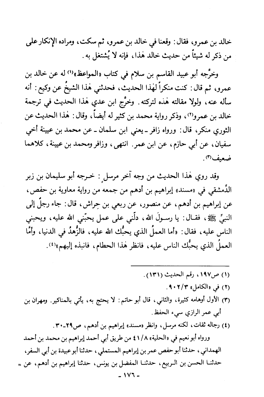 وَخَرَّجَهُ أَبُو عُبَيْدٍ الْقَاسِمُ بْنُ سَلَّامٍ فِي كِتَابِ " الْمَوَاعِظِ " لَهُ عَنْ خَالِدِ بْنِ عَمْرٍو، ثُمَّ قَالَ: كُنْتُ مُنْكِرًا لِهَذَا الْحَدِيثِ، فَحَدَّثَنِي هَذَا الشَّيْخُ يَعْنِي عَنْ وَكِيعٍ: أَنَّهُ سَأَلَهُ عَنْهُ، وَلَوْلَا مَقَالَتُهُ هَذِهِ لَتَرَكْتُهُ. وَخَرَّجَ ابْنُ عَدِيٍّ هَذَا الْحَدِيثَ فِي تَرْجَمَةِ خَالِدِ بْنِ عَمْرٍو، وَذَكَرَ رِوَايَةَ مُحَمَّدِ بْنِ كَثِيرٍ لَهُ أَيْضًا، وَقَالَ: هَذَا الْحَدِيثُ عَنِ الثَّوْرِيِّ مُنْكَرٌ، وَقَالَ: وَرَوَاهُ زَافِرٌ - يَعْنِي ابْنَ سَلْمَانَ - عَنْ مُحَمَّدِ بْنِ عُيَيْنَةَ أَخِي سُفْيَانَ، عَنْ أَبِي حَازِمٍ، عَنِ ابْنِ عُمَرَ. انْتَهَى، وَزَافِرٌ وَمُحَمَّدُ بْنُ عُيَيْنَةَ، كِلَاهُمَا ضَعِيفٌ.