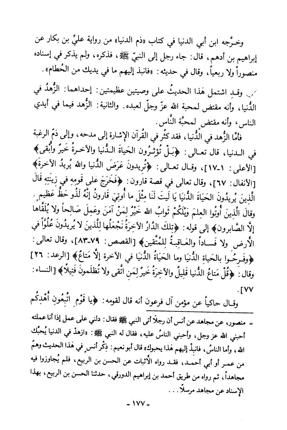 فَأَمَّا الزُّهْدُ فِي الدُّنْيَا، فَقَدْ كَثُرَ فِي الْقُرْآنِ الْإِشَارَةُ إِلَى مَدْحِهِ، وَإِلَى ذَمِّ الرَّغْبَةِ فِي الدُّنْيَا، قَالَ تَعَالَى: {بَلْ تُؤْثِرُونَ الْحَيَاةَ الدُّنْيَا - وَالْآخِرَةُ خَيْرٌ وَأَبْقَى} [الأعلى: 16 - 17] [الْأَعْلَى: 17] ، وَقَالَ تَعَالَى: {تُرِيدُونَ عَرَضَ الدُّنْيَا وَاللَّهُ يُرِيدُ الْآخِرَةَ} [الأنفال: 67] [الْأَنْفَالِ: 67] وَقَالَ تَعَالَى فِي قِصَّةِ قَارُونَ: {فَخَرَجَ عَلَى قَوْمِهِ فِي زِينَتِهِ قَالَ الَّذِينَ يُرِيدُونَ الْحَيَاةَ الدُّنْيَا يَالَيْتَ لَنَا مِثْلَ مَا أُوتِيَ قَارُونُ إِنَّهُ لَذُو حَظٍّ عَظِيمٍ - وَقَالَ الَّذِينَ أُوتُوا الْعِلْمَ وَيْلَكُمْ ثَوَابُ اللَّهِ خَيْرٌ لِمَنْ آمَنَ وَعَمِلَ صَالِحًا وَلَا يُلَقَّاهَا إِلَّا الصَّابِرُونَ} [القصص: 79 - 80] إِلَى قَوْلِهِ: {تِلْكَ الدَّارُ الْآخِرَةُ نَجْعَلُهَا لِلَّذِينَ لَا يُرِيدُونَ عُلُوًّا فِي الْأَرْضِ وَلَا فَسَادًا وَالْعَاقِبَةُ لِلْمُتَّقِينَ} [القصص: 83] [الْقَصَصِ: 79 - 83] ، وَقَالَ تَعَالَى: {وَفَرِحُوا بِالْحَيَاةِ الدُّنْيَا وَمَا الْحَيَاةُ الدُّنْيَا فِي الْآخِرَةِ إِلَّا مَتَاعٌ} [الرعد: 26] [الرَّعْدِ: 26] وَقَالَ {قُلْ مَتَاعُ الدُّنْيَا قَلِيلٌ وَالْآخِرَةُ خَيْرٌ لِمَنِ اتَّقَى وَلَا تُظْلَمُونَ فَتِيلًا} [النساء: 77] [النِّسَاءِ: 77] .