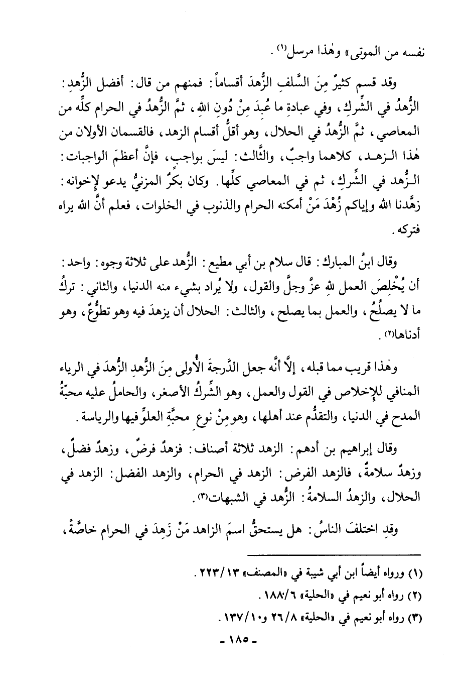 وَقَدْ قَسَّمَ كَثِيرٌ مِنَ السَّلَفِ الزُّهْدَ أَقْسَامًا: فَمِنْهُمْ مَنْ قَالَ: أَفْضَلُ الزُّهْدِ الزُّهْدُ فِي الشِّرْكِ، وَفِي عِبَادَةِ مَا عُبِدَ مِنْ دُونِ اللَّهِ، ثُمَّ الزُّهْدُ فِي الْحَرَامِ كُلِّهِ مِنَ الْمَعَاصِي، ثُمَّ الزُّهْدُ فِي الْحَلَالِ، وَهُوَ أَقَلُّ أَقْسَامِ الزُّهْدِ، فَالْقِسْمَانِ الْأَوَّلَانِ مِنْ هَذَا الزُّهْدِ، كِلَاهُمَا وَاجِبٌ، وَالثَّالِثُ: لَيْسَ بِوَاجِبٍ، فَإِنَّ أَعْظَمَ الْوَاجِبَاتِ الزُّهْدُ فِي الشِّرْكِ، ثُمَّ فِي الْمَعَاصِي كُلِّهَا. وَكَانَ بَكْرٌ الْمُزَنِيُّ يَدْعُو لِإِخْوَانِهِ: زَهَّدَنَا اللَّهُ وَإِيَّاكُمْ زُهْدَ مَنْ أَمْكَنَهُ الْحَرَامَ وَالذُّنُوبَ فِي الْخَلَوَاتِ، فَعَلِمَ أَنَّ اللَّهَ يَرَاهُ فَتَرَكَهُ.