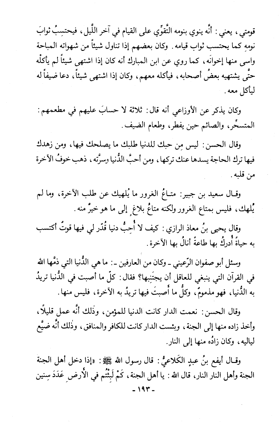 وَسُئِلَ أَبُو صَفْوَانَ الرُّعَيْنِيُّ - وَكَانَ مِنَ الْعَارِفِينَ -: مَا هِيَ الدُّنْيَا الَّتِي ذَمَّهَا اللَّهُ فِي الْقُرْآنِ الَّتِي يَنْبَغِي لِلْعَاقِلِ أَنْ يَتَجَنَّبَهَا؟ فَقَالَ: كُلُّ مَا أَصَبْتَ فِي الدُّنْيَا تُرِيدُ بِهِ الدُّنْيَا، فَهُوَ مَذْمُومٌ، وَكُلُّ مَا أَصَبْتَ فِيهَا تُرِيدُ بِهِ الْآخِرَةَ، فَلَيْسَ مِنْهَا.