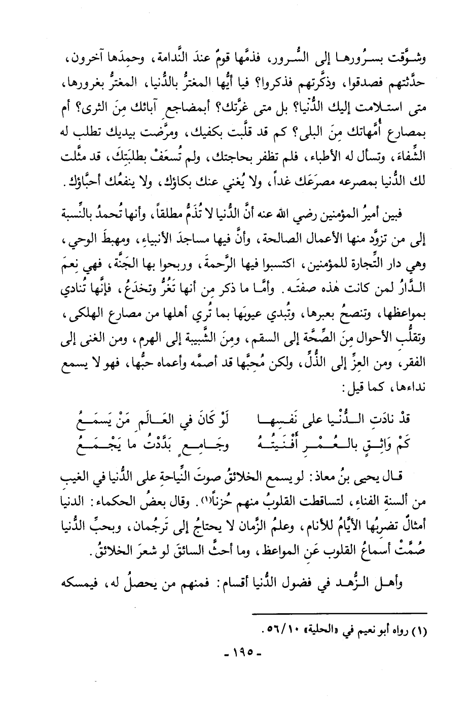 وَقَالَ يَحْيَى بْنُ مُعَاذٍ: لَوْ يَسْمَعُ الْخَلَائِقَ صَوْتَ النِّيَاحَةِ عَلَى الدُّنْيَا فِي الْغَيْبِ مِنْ أَلْسِنَةِ الْفَنَاءِ، لَتَسَاقَطَتِ الْقُلُوبُ مِنْهُمْ حُزْنًا. وَقَالَ بَعْضُ الْحُكَمَاءِ: الدُّنْيَا أَمْثَالٌ تَضْرِبُهَا الْأَيَّامُ لِلْأَنَامِ، وَعِلْمُ الزَّمَانِ لَا يَحْتَاجُ إِلَى تُرْجُمَانِ، وَبِحُبِّ الدُّنْيَا صُمَّتْ أَسْمَاعُ الْقُلُوبِ عَنِ الْمَوَاعِظِ، وَمَا أَحَثَّ السَّائِقَ لَوْ شَعَرَ الْخَلَائِقُ.