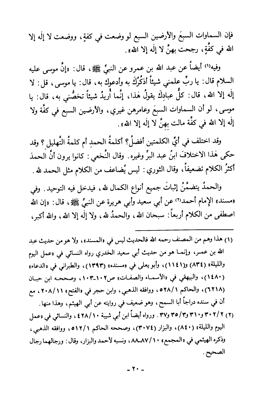 فَإِنَّ السَّمَاوَاتِ السَّبْعَ وَالْأَرْضِينَ السَّبْعَ لَوْ وُضِعَتْ فِي كِفَّةٍ، وَوُضِعَتْ لَا إِلَهَ إِلَّا اللَّهُ فِي كِفَّةٍ، رَجَحَتْ بِهِنَّ لَا إِلَهَ إِلَّا اللَّهُ» . وَفِيهِ أَيْضًا عَنْ عَبْدِ اللَّهِ بْنِ عُمَرَ عَنِ النَّبِيِّ صَلَّى اللَّهُ عَلَيْهِ وَسَلَّمَ، قَالَ: «إِنَّ مُوسَى عَلَيْهِ السَّلَامُ قَالَ: يَا رَبِّ عَلِّمْنِي شَيْئًا أَذْكُرُكَ بِهِ وَأَدْعُوكَ بِهِ، قَالَ: يَا مُوسَى، قُلْ: لَا إِلَهَ إِلَّا اللَّهُ، قَالَ: كُلُّ عِبَادِكَ يَقُولُ هَذَا، إِنَّمَا أُرِيدُ شَيْئًا تَخُصُّنِي بِهِ، قَالَ: يَا مُوسَى، لَوْ أَنَّ السَّمَاوَاتِ السَّبْعَ وَعَامِرَهُنَّ غَيْرِي، وَالْأَرْضِينَ السَّبْعَ فِي كِفَّةٍ وَلَا إِلَهَ إِلَّا اللَّهُ فِي كِفَّةٍ مَالَتْ بِهِنَّ لَا إِلَهَ إِلَّا اللَّهُ» . وَقَدِ اخْتُلِفَ أَيُّ الْكَلِمَتَيْنِ أَفْضَلُ؟ أَكَلِمَةُ الْحَمْدِ أَمْ كَلِمَةُ التَّهْلِيلِ؟ وَقَدْ حَكَى هَذَا الِاخْتِلَافَ ابْنُ عَبْدِ الْبَرِّ وَغَيْرُهُ. وَقَالَ النَّخَعِيُّ: كَانُوا يَرَوْنَ أَنَّ الْحَمْدَ أَكْثَرُ الْكَلَامِ تَضْعِيفًا، وَقَالَ الثَّوْرِيُّ: لَيْسَ يُضَاعَفُ مِنَ الْكَلَامِ مِثْلُ الْحَمْدِ لِلَّهِ. وَالْحَمْدُ يَتَضَمَّنُ إِثْبَاتَ جَمِيعِ أَنْوَاعِ الْكَمَالِ لِلَّهِ، فَيَدْخُلُ فِيهِ التَّوْحِيدُ. وَفِي " مُسْنَدِ " الْإِمَامِ أَحْمَدَ عَنْ أَبِي سَعِيدٍ وَأَبِي هُرَيْرَةَ عَنِ النَّبِيِّ صَلَّى اللَّهُ عَلَيْهِ وَسَلَّمَ قَالَ: «إِنَّ اللَّهَ اصْطَفَى مِنَ الْكَلَامِ أَرْبَعًا: سُبْحَانَ اللَّهِ، وَالْحَمْدُ لِلَّهِ، وَلَا إِلَهَ إِلَّا اللَّهُ، وَاللَّهُ أَكْبَرُ،