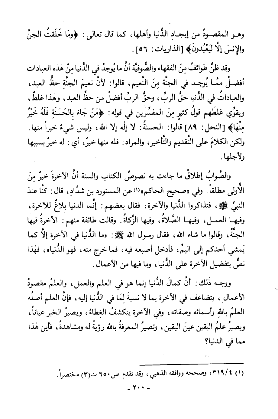 وَالصَّوَابُ إِطْلَاقُ مَا جَاءَتْ بِهِ نُصُوصُ الْكِتَابِ وَالسُّنَّةِ أَنَّ الْآخِرَةَ خَيْرٌ مِنَ الْأُولَى مُطْلَقًا. وَفِي " صَحِيحِ الْحَاكِمِ " عَنِ الْمُسْتَوْرِدِ بْنِ شَدَّادٍ، قَالَ: «كُنَّا عِنْدَ النَّبِيِّ صَلَّى اللَّهُ عَلَيْهِ وَسَلَّمَ، فَتَذَكَّرُوا الدُّنْيَا وَالْآخِرَةَ: فَقَالَ بَعْضُهُمْ: إِنَّمَا الدُّنْيَا بَلَاغٌ لِلْآخِرَةِ، وَفِيهَا الْعَمَلُ، وَفِيهَا الصَّلَاةُ، وَفِيهَا الزَّكَاةُ. وَقَالَتْ طَائِفَةٌ مِنْهُمْ: الْآخِرَةُ فِيهَا الْجَنَّةٌ، وَقَالُوا مَا شَاءَ اللَّهُ، فَقَالَ رَسُولُ اللَّهِ صَلَّى اللَّهُ عَلَيْهِ وَسَلَّمَ: مَا الدُّنْيَا فِي الْآخِرَةِ إِلَّا كَمَا يَمْشِي أَحَدُكُمْ إِلَى الْيَمِّ، فَأَدْخَلَ أُصْبُعَهُ فِيهِ، فَمَا خَرَجَ مِنْهُ فَهُوَ الدُّنْيَا» فَهَذَا نَصٌّ بِتَفْضِيلِ الْآخِرَةِ عَلَى الدُّنْيَا، وَمَا فِيهَا مِنَ الْأَعْمَالِ.