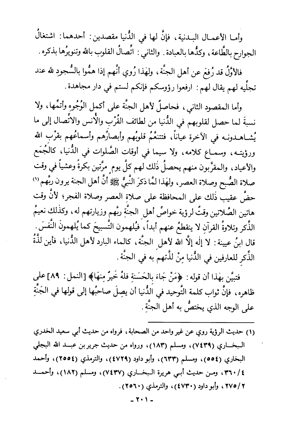 وَأَمَّا الْمَقْصُودُ الثَّانِي، فَحَاصِلٌ لِأَهْلِ الْجَنَّةِ عَلَى أَكْمَلِ الْوُجُوهِ وَأَتَمِّهَا، وَلَا نِسْبَةَ لِمَا حَصَلَ لِقُلُوبِهِمْ فِي الدُّنْيَا مِنْ لَطَائِفِ الْقُرْبُ وَالْأُنْسِ وَالِاتِّصَالِ إِلَى مَا يُشَاهِدُونَهُ فِي الْآخِرَةِ عِيَانًا، فَتَتَنَعَّمُ قُلُوبُهُمْ وَأَبْصَارُهُمْ وَأَسْمَاعُهُمْ بِقُرْبِ اللَّهِ وَرُؤْيَتِهِ، وَسَمَاعِ كَلَامِهِ، وَلَا سِيَّمَا فِي أَوْقَاتِ الصَّلَوَاتِ فِي الدُّنْيَا، كَالْجُمَعِ وَالْأَعْيَادِ، وَالْمُقَرَّبُونَ مِنْهُمْ يَحْصُلُ ذَلِكَ لَهُمْ كُلَّ يَوْمٍ مَرَّتَيْنِ بُكْرَةً وَعَشِيًّا فِي وَقْتِ صَلَاةِ الصُّبْحِ وَصَلَاةِ الْعَصْرِ، وَلِهَذَا لَمَّا ذَكَرَ النَّبِيُّ صَلَّى اللَّهُ عَلَيْهِ وَسَلَّمَ أَنَّ أَهْلَ الْجَنَّةِ يَرَوْنَ رَبَّهُمْ، حَضَّ عَقِيبَ ذَلِكَ عَلَى الْمُحَافَظَةِ عَلَى صَلَاةِ الْعَصْرِ وَصَلَاةِ الْفَجْرِ؛ لِأَنَّ وَقْتَ هَاتَيْنِ الصَّلَاتَيْنِ وَقْتٌ لِرُؤْيَةِ خَوَاصِّ أَهْلِ الْجَنَّةِ رَبَّهُمْ وَزِيَارَتِهِمْ لَهُ، وَكَذَلِكَ نَعِيمُ الذِّكْرِ وَتِلَاوَةُ الْقُرْآنِ لَا يَنْقَطِعُ عَنْهُمْ أَبَدًا، فَيُلْهَمُونَ التَّسْبِيحَ كَمَا يُلْهَمُونَ النَّفَسَ. قَالَ ابْنُ عُيَيْنَةَ: لَا إِلَهَ إِلَّا اللَّهُ لِأَهْلِ الْجَنَّةِ، كَالْمَاءِ الْبَارِدِ لِأَهْلِ الدُّنْيَا، فَأَيْنَ لَذَّةُ الذِّكْرِ لِلْعَارِفِينَ فِي الدُّنْيَا مِنْ لَذَّتِهِمْ بِهِ فِي الْجَنَّةِ.