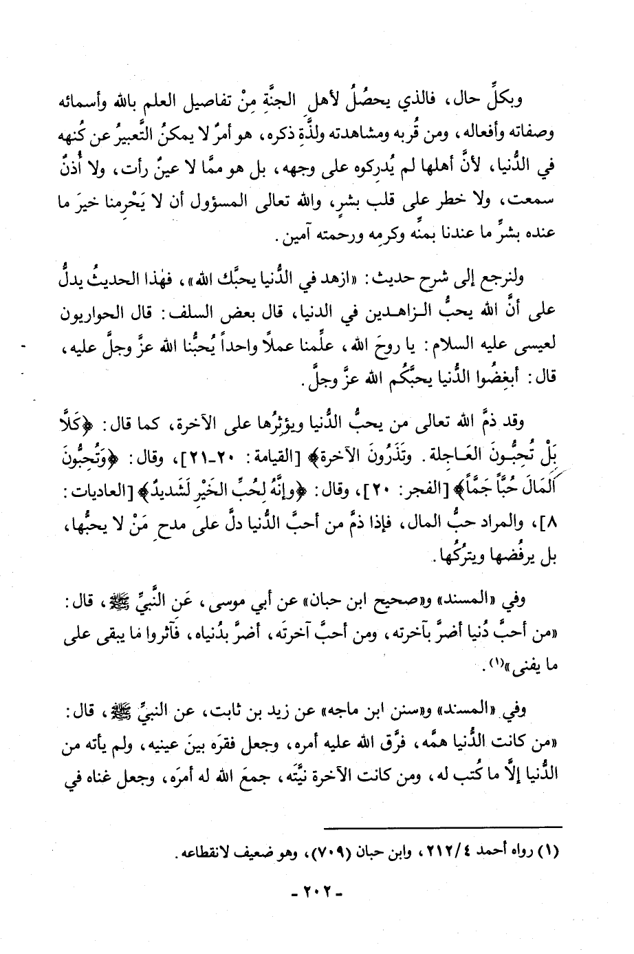 وَفِي " الْمُسْنَدِ " وَ " صَحِيحِ ابْنِ حِبَّانَ " عَنْ أَبِي مُوسَى، عَنِ النَّبِيِّ صَلَّى اللَّهُ عَلَيْهِ وَسَلَّمَ، قَالَ: «مَنْ أَحَبَّ دُنْيَاهُ أَضَرَّ بِآخِرَتِهِ، وَمَنْ أَحَبَّ آخِرَتَهُ، أَضَرَّ بِدُنْيَاهُ، فَآثِرُوا مَا يَبْقَى عَلَى مَا يَفْنَى» .