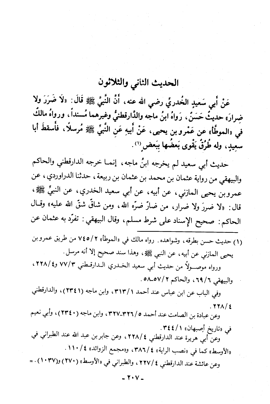 عَنْ أَبِي سَعِيدٍ الْخُدْرِيِّ رَضِيَ اللَّهُ عَنْهُ، أَنَّ النَّبِيَّ صَلَّى اللَّهُ عَلَيْهِ وَسَلَّمَ قَالَ: «لَا ضَرَرَ وَلَا ضِرَارَ» حَدِيثٌ حَسَنٌ، رَوَاهُ ابْنُ مَاجَهْ وَالدَّارَقُطْنِيُّ وَغَيْرُهُمَا مُسْنَدًا، وَرَوَاهُ مَالِكٌ فِي " الْمُوَطَّإِ " عَنْ عَمْرِو بْنِ يَحْيَى، عَنْ أَبِيهِ، عَنِ النَّبِيِّ صَلَّى اللَّهُ عَلَيْهِ وَسَلَّمَ مُرْسَلًا، فَأَسْقَطَ أَبَا سَعِيدٍ، وَلَهُ طُرُقٌ يَقْوَى بَعْضُهَا بِبَعْضٍ.