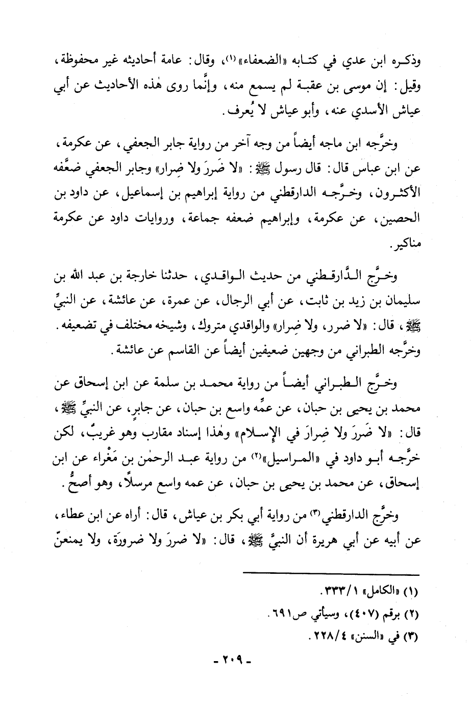 وَخَرَّجَهُ ابْنُ مَاجَهْ أَيْضًا مِنْ وَجْهٍ آخَرَ مِنْ رِوَايَةِ جَابِرٍ الْجُعْفِيِّ، عَنْ عِكْرِمَةَ، عَنِ ابْنِ عَبَّاسٍ قَالَ: قَالَ رَسُولُ اللَّهِ صَلَّى اللَّهُ عَلَيْهِ وَسَلَّمَ: «لَا ضَرَرَ وَلَا ضِرَارَ» وَجَابِرٌ الْجُعْفِيُّ ضَعَّفَهُ الْأَكْثَرُونَ، وَخَرَّجَهُ الدَّارَقُطْنِيُّ مِنْ رِوَايَةِ إِبْرَاهِيمَ بْنِ إِسْمَاعِيلَ، عَنْ دَاوُدَ بْنِ الْحُصَيْنِ، عَنْ عِكْرِمَةَ وَإِبْرَاهِيمَ ضَعَّفَهُ جَمَاعَةٌ، وَرِوَايَاتُ دَاوُدَ عَنْ عِكْرِمَةَ مَنَاكِيرُ.