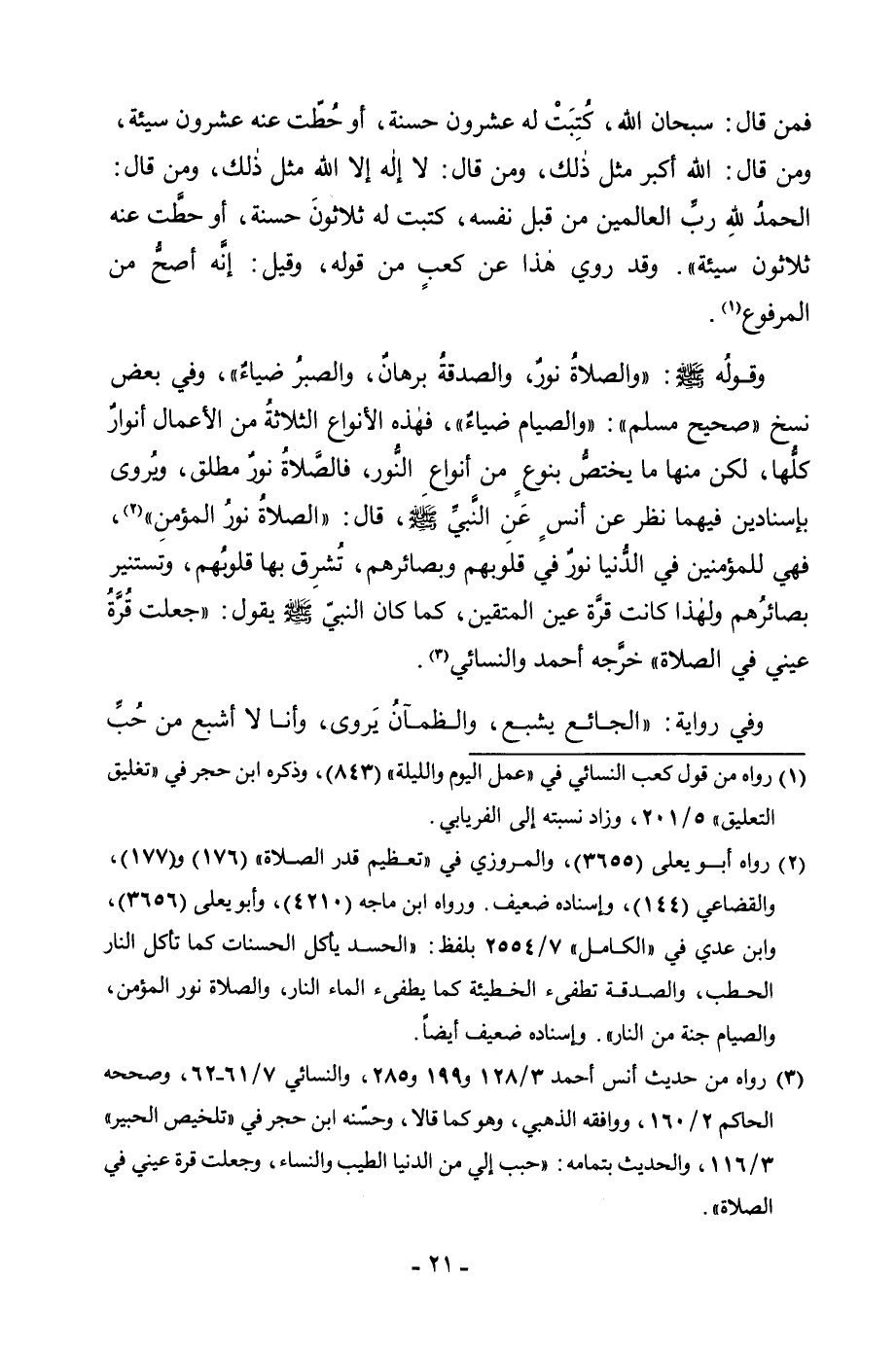 وَقَوْلُهُ صَلَّى اللَّهُ عَلَيْهِ وَسَلَّمَ: " «وَالصَّلَاةُ نُورٌ، وَالصَّدَقَةُ بُرْهَانٌ، وَالصَّبْرُ ضِيَاءٌ» "، وَفِي بَعْضِ نُسَخِ " صَحِيحِ مُسْلِمٍ ": " «وَالصِّيَامُ ضِيَاءٌ» " فَهَذِهِ الْأَنْوَاعُ الثَّلَاثَةُ مِنَ الْأَعْمَالِ أَنْوَارٌ كُلُّهَا، لَكِنَّ مِنْهَا مَا يَخْتَصُّ بِنَوْعٍ مِنْ أَنْوَاعِ النُّورِ، فَالصَّلَاةُ نُورٌ مُطْلَقٌ، وَيُرْوَى بِإِسْنَادَيْنِ فِيهِمَا نَظَرٌ عَنْ أَنَسٍ عَنِ النَّبِيِّ صَلَّى اللَّهُ عَلَيْهِ وَسَلَّمَ قَالَ: " «الصَّلَاةُ نُورُ الْمُؤْمِنِ» "، فَهِيَ لِلْمُؤْمِنِينَ فِي الدُّنْيَا نُورٌ فِي قُلُوبِهِمْ وَبَصَائِرِهِمْ، تُشْرِقُ بِهَا قُلُوبُهُمْ، وَتَسْتَنِيرُ بَصَائِرُهُمْ وَلِهَذَا كَانَتْ قُرَّةَ عَيْنِ الْمُتَّقِينَ، كَمَا كَانَ النَّبِيُّ صَلَّى اللَّهُ عَلَيْهِ وَسَلَّمَ يَقُولُ: " «جُعِلَتْ قُرَّةُ عَيْنِي فِي الصَّلَاةِ» " خَرَّجَهُ أَحْمَدُ وَالنَّسَائِيُّ. وَفِي رِوَايَةٍ: " «الْجَائِعُ يَشْبَعُ، وَالظَّمْآنُ يَرْوَى، وَأَنَا لَا أَشْبَعُ مِنْ حُبِّ