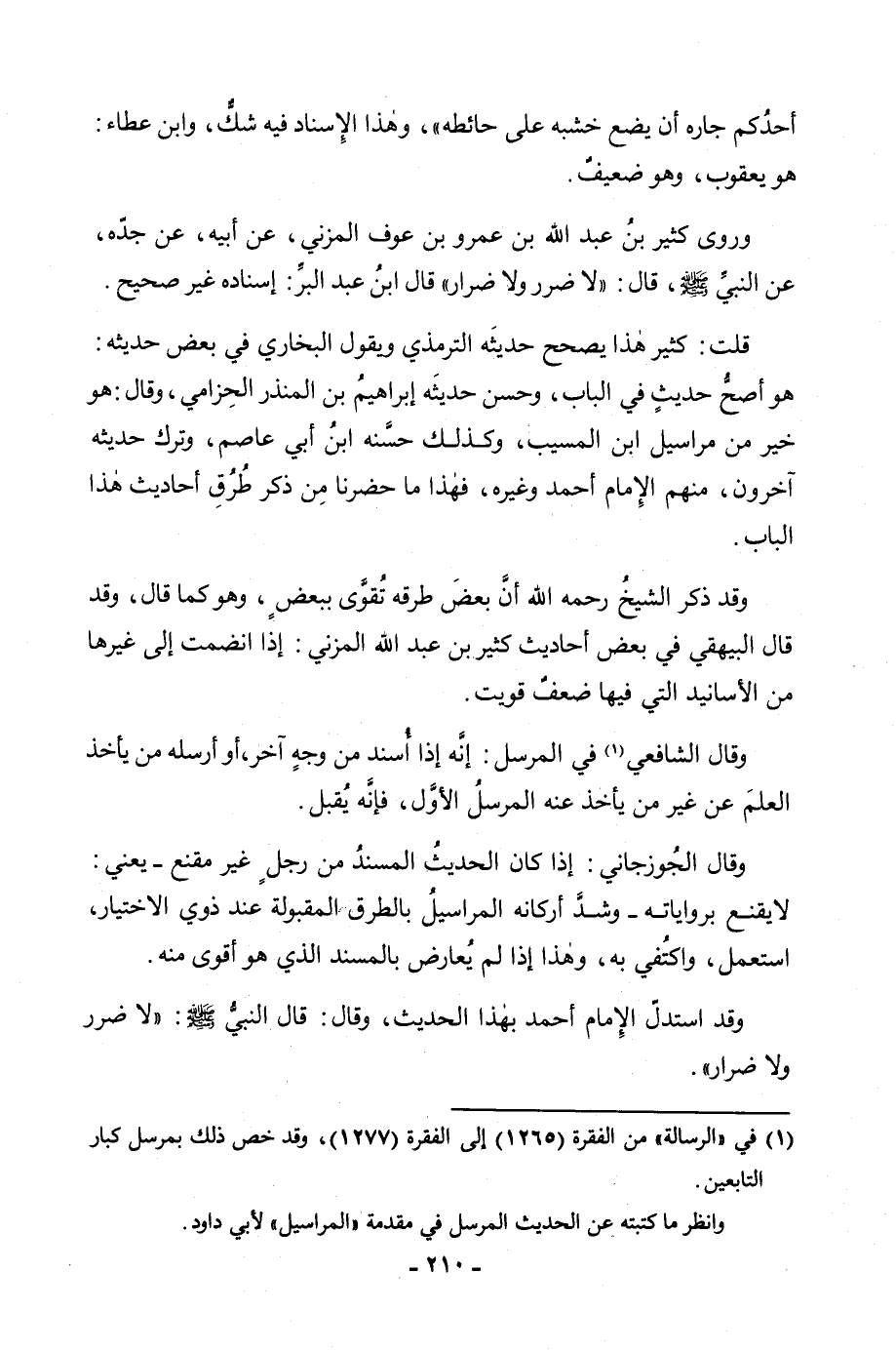 وَرَوَى كَثِيرُ بْنُ عَبْدِ اللَّهِ بْنِ عَمْرِو بْنِ عَوْفٍ الْمُزَنِيُّ، عَنْ أَبِيهِ، عَنْ جَدِّهِ، عَنِ النَّبِيِّ صَلَّى اللَّهُ عَلَيْهِ وَسَلَّمَ، قَالَ: «لَا ضَرَرَ وَلَا إِضْرَارَ» قَالَ ابْنُ عَبْدِ الْبَرِّ: إِسْنَادُهُ غَيْرُ صَحِيحٍ.
