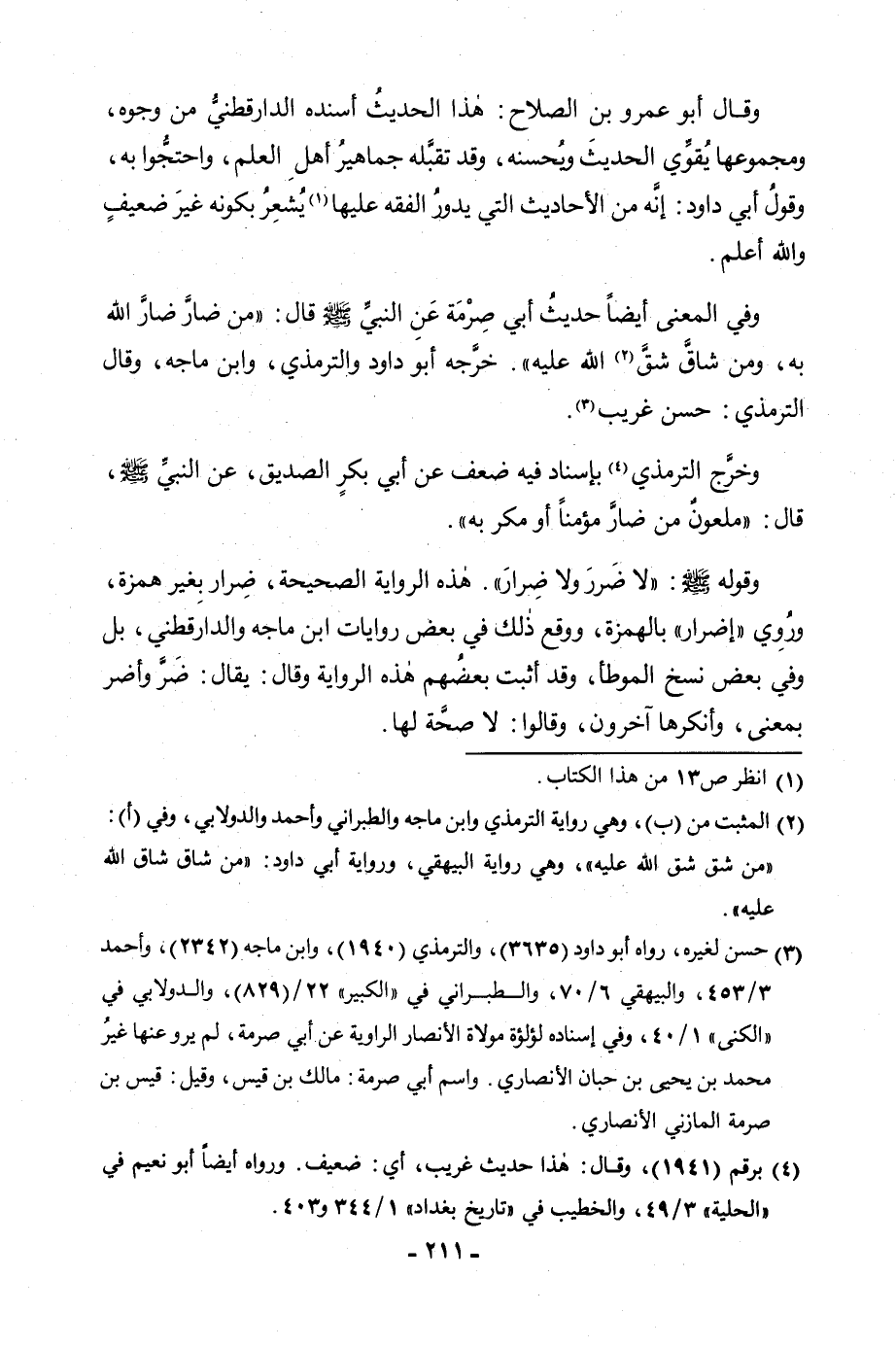 وَقَوْلُهُ صَلَّى اللَّهُ عَلَيْهِ وَسَلَّمَ: «لَا ضَرَرَ وَلَا ضِرَارَ» . هَذِهِ الرِّوَايَةُ الصَّحِيحَةُ، ضِرَارٌ بِغَيْرِ هَمْزَةٍ، وَرُوِيَ " إِضْرَارٌ " بِالْهَمْزَةِ، وَوَقَعَ ذَلِكَ فِي بَعْضِ رِوَايَاتِ ابْنِ مَاجَهْ وَالدَّارَقُطْنِيِّ، بَلْ وَفِي بَعْضِ نُسَخِ الْمُوَطَّإِ، وَقَدْ أَثْبَتَ بَعْضُهُمْ هَذِهِ الرِّوَايَةَ وَقَالَ: ضَرَّ وَأَضَرَّ بِمَعْنًى وَاحِدٍ، وَأَنْكَرَهَا آخَرُونَ، وَقَالُوا: لَا صِحَّةَ لَهَا.