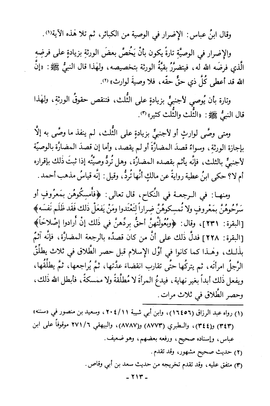 وَتَارَةً بِأَنْ يُوصِيَ لِأَجْنَبِيٍّ بِزِيَادَةٍ عَلَى الثُّلُثِ، فَتَنْقُصُ حُقُوقُ الْوَرَثَةِ، وَلِهَذَا قَالَ النَّبِيُّ صَلَّى اللَّهُ عَلَيْهِ وَسَلَّمَ: «الثُّلُثُ وَالثُّلُثُ كَثِيرٌ» .