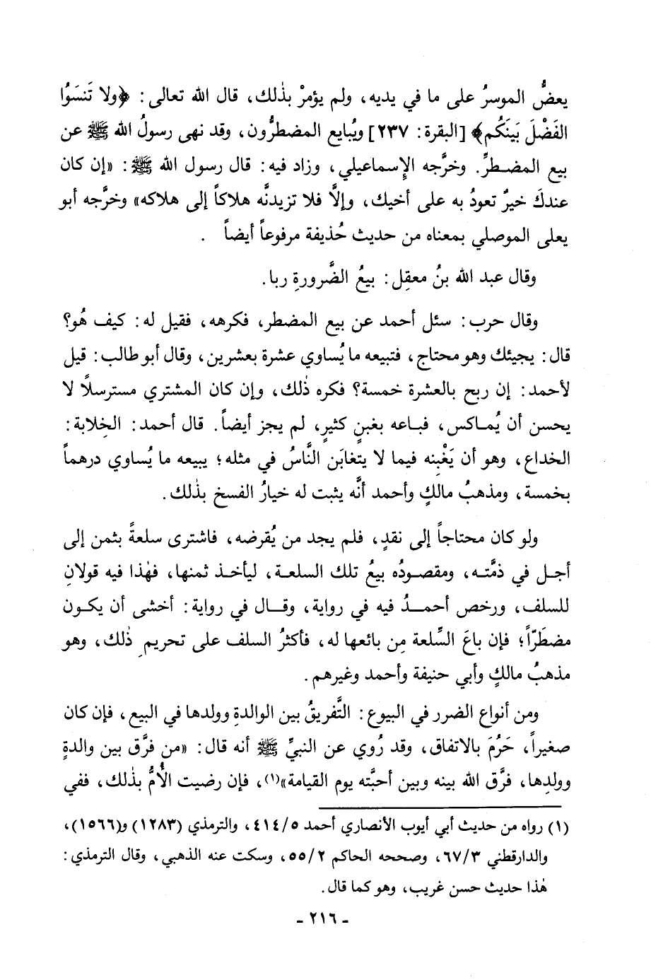 وَمِنْ أَنْوَاعِ الضَّرَرِ فِي الْبُيُوعِ: التَّفْرِيقُ بَيْنَ الْوَالِدَةِ وَوَلَدِهَا فِي الْبَيْعِ، فَإِنْ كَانَ صَغِيرًا، حَرُمَ بِالِاتِّفَاقِ، وَقَدْ رُوِيَ عَنِ النَّبِيِّ صَلَّى اللَّهُ عَلَيْهِ وَسَلَّمَ أَنَّهُ قَالَ: «مَنْ فَرَّقَ بَيْنَ وَالِدَةٍ وَوَلَدِهَا، فَرَّقَ اللَّهُ بَيْنَهُ وَبَيْنَ أَحِبَّتِهِ يَوْمَ الْقِيَامَةِ» ، فَإِنْ رَضِيَتِ الْأُمُّ بِذَلِكَ، فَفِي