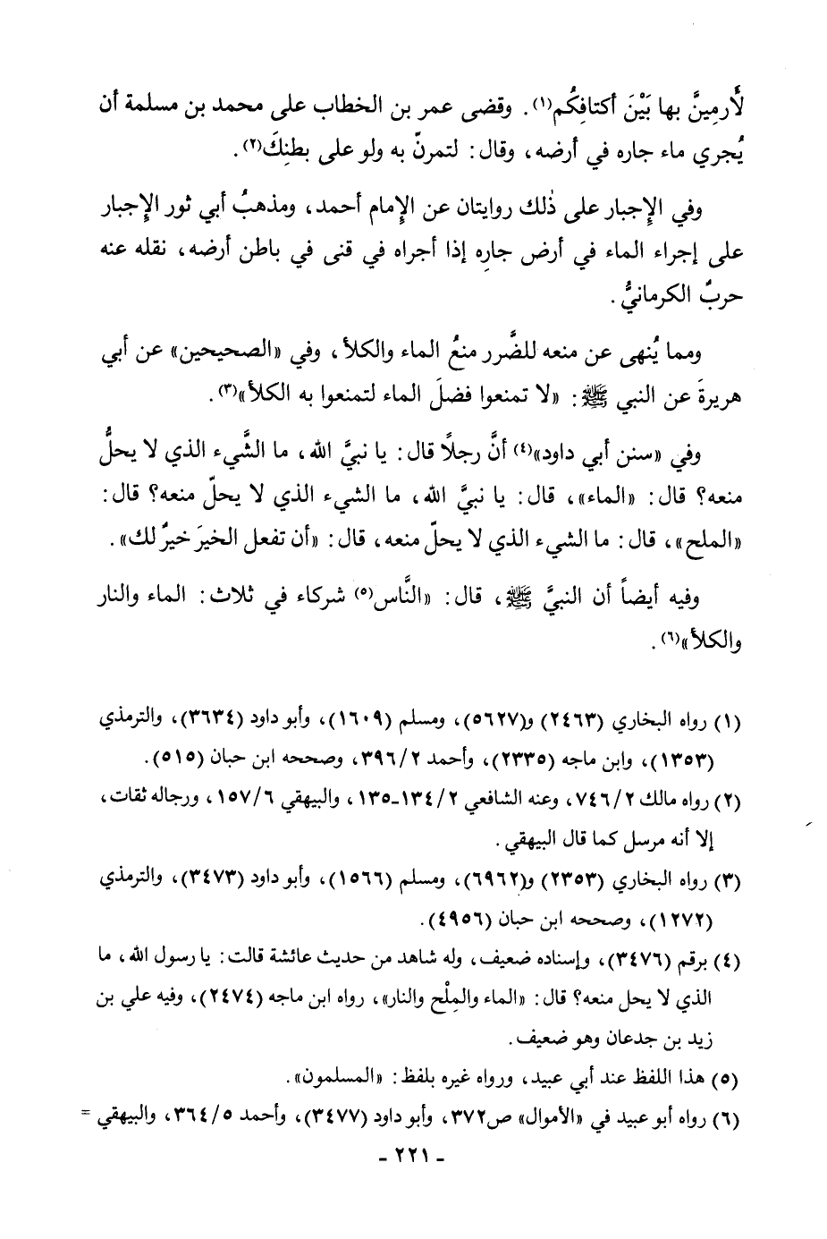 وَمِمَّا يُنْهَى عَنْ مَنْعِهِ للضَّرَرِ مَنْعُ الْمَاءِ وَالْكَلَأِ، وَفِي " الصَّحِيحَيْنِ " عَنْ أَبِي هُرَيْرَةَ عَنِ النَّبِيِّ صَلَّى اللَّهُ عَلَيْهِ وَسَلَّمَ: «لَا تَمْنَعُوا فَضْلَ الْمَاءِ لِتَمْنَعُوا بِهِ الْكَلَأَ» .