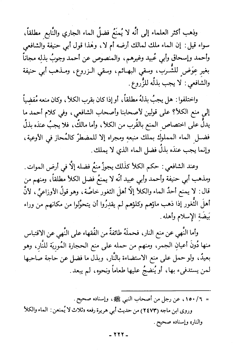وَمَذْهَبُ أَبِي حَنِيفَةَ وَأَحْمَدَ وَأَبِي عُبَيْدٍ أَنَّهُ لَا يُمْنَعُ فَضْلُ الْكَلَأِ مُطْلَقًا، وَمِنْهُمْ مَنْ قَالَ: لَا يَمْنَعُ أَحَدٌ الْمَاءَ وَالْكَلَأَ إِلَّا أَهْلَ الثُّغُورِ خَاصَّةً، وَهُوَ قَوْلُ الْأَوْزَاعِيِّ، لِأَنَّ أَهْلَ الثُّغُورِ إِذَا ذَهَبَ مَاؤُهُمْ وَكَلَؤُهُمْ لَمْ يَقْدِرُوا أَنْ يَتَحَوَّلُوا مِنْ مَكَانِهِمْ مِنْ وَرَاءِ بَيْضَةِ الْإِسْلَامِ وَأَهْلِهِ.