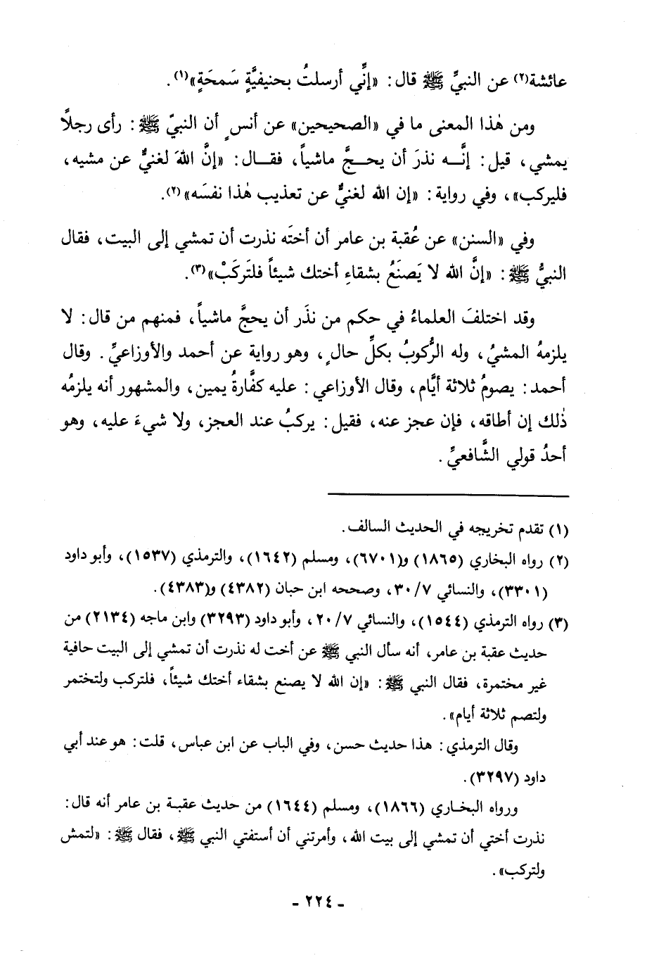 وَفِي " السُّنَنِ " «عَنْ عُقْبَةَ بْنِ عَامِرٍ أَنَّ أُخْتَهُ نَذَرَتْ أَنْ تَمْشِيَ إِلَى الْبَيْتِ، فَقَالَ النَّبِيُّ صَلَّى اللَّهُ عَلَيْهِ وَسَلَّمَ: إِنَّ اللَّهَ لَا يَصْنَعُ بِشَقَاءِ أُخْتِكِ شَيْئًا فَلْتَرْكَبْ» .