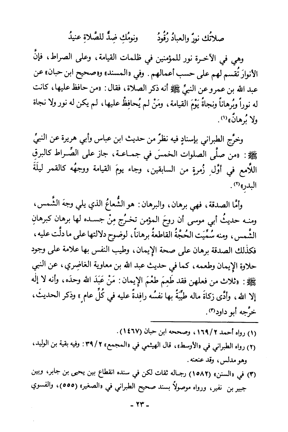 وَهِيَ فِي الْآخِرَةِ نُورٌ لِلْمُؤْمِنِينَ فِي ظُلُمَاتِ الْقِيَامَةِ، وَعَلَى الصِّرَاطِ، فَإِنَّ الْأَنْوَارَ تُقَسَّمُ لَهُمْ عَلَى حَسَبِ أَعْمَالِهِمْ. وَفِي " الْمُسْنَدِ " وَ " صَحِيحِ ابْنِ حِبَّانَ " عَنْ عَبْدِ اللَّهِ بْنِ عُمَرَ وَعَنِ النَّبِيِّ صَلَّى اللَّهُ عَلَيْهِ وَسَلَّمَ أَنَّهُ ذَكَرَ الصَّلَاةَ، فَقَالَ: «مَنْ حَافَظَ عَلَيْهَا، كَانَتْ لَهُ نُورًا وَبُرْهَانًا وَنَجَاةً يَوْمَ الْقِيَامَةِ، وَمَنْ لَمْ يُحَافِظْ عَلَيْهَا، لَمْ يَكُنْ لَهُ نُورٌ وَلَا نَجَاةٌ وَلَا بُرْهَانٌ» . وَخَرَّجَ الطَّبَرَانِيُّ بِإِسْنَادٍ فِيهِ نَظَرٌ مِنْ حَدِيثِ ابْنِ عَبَّاسٍ وَأَبِي هُرَيْرَةَ عَنِ النَّبِيِّ صَلَّى اللَّهُ عَلَيْهِ وَسَلَّمَ " «مَنْ صَلَّى الصَّلَوَاتِ الْخَمْسَ فِي جَمَاعَةٍ، جَازَ عَلَى الصِّرَاطِ كَالْبَرْقِ اللَّامِعِ فِي أَوَّلِ زُمْرَةٍ مِنَ السَّابِقِينَ، وَجَاءَ يَوْمَ الْقِيَامَةِ، وَوَجْهُهُ كَالْقَمَرِ لَيْلَةَ الْبَدْرِ» ". وَأَمَّا الصَّدَقَةُ، فَهِيَ بُرْهَانٌ، وَالْبُرْهَانُ: هُوَ الشُّعَاعُ الَّذِي يَلِي وَجْهَ الشَّمْسِ، وَمِنْهُ حَدِيثُ أَبِي مُوسَى أَنَّ رُوحَ الْمُؤْمِنِ تَخْرُجُ مِنْ جَسَدِهِ لَهَا بُرْهَانٌ كَبُرْهَانِ الشَّمْسِ، وَمِنْهُ سُمِّيَتِ الْحُجَّةُ الْقَاطِعَةُ بُرْهَانًا، لِوُضُوحِ دِلَالَاتِهَا عَلَى مَا دَلَّتْ عَلَيْهِ، فَكَذَلِكَ الصَّدَقَةُ بُرْهَانٌ عَلَى صِحَّةِ الْإِيمَانِ، وَطِيبُ النَّفْسِ بِهَا عَلَامَةٌ عَلَى وُجُودِ حَلَاوَةِ الْإِيمَانِ وَطَعْمِهِ، كَمَا فِي حَدِيثِ عَبْدِ اللَّهِ بْنِ مُعَاوِيَةَ الْغَاضِرِيِّ، عَنِ النَّبِيِّ صَلَّى اللَّهُ عَلَيْهِ وَسَلَّمَ: " «ثَلَاثٌ مَنْ فَعَلَهُنَّ فَقَدْ طَعِمَ طَعْمَ الْإِيمَانِ: مَنْ عَبَدَ اللَّهَ وَحْدَهُ، وَأَنَّهُ لَا إِلَهَ إِلَّا اللَّهُ، وَأَدَّى زَكَاةَ مَالِهِ طَيِّبَةً بِهَا نَفْسُهُ رَافِدَةً عَلَيْهِ فِي كُلِّ عَامٍ» " وَذَكَرَ الْحَدِيثَ، خَرَّجَهُ أَبُو دَاوُدَ.