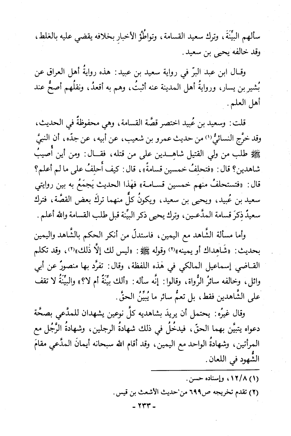قُلْتُ: وَسَعِيدُ بْنُ عُبَيْدٍ اخْتَصَرَ قِصَّةَ الْقَسَامَةَ، وَهِيَ مَحْفُوظَةٌ فِي الْحَدِيثِ، فَقَدْ خَرَّجَ النَّسَائِيُّ مِنْ حَدِيثِ عَمْرِو بْنِ شُعَيْبٍ، عَنْ أَبِيهِ، عَنْ جَدِّهِ، «أَنَّ النَّبِيَّ صَلَّى اللَّهُ عَلَيْهِ وَسَلَّمَ طَلَبَ مِنْ وَلِيِّ الْقَتِيلِ شَاهِدَيْنِ عَلَى مَنْ قَتَلَهُ، فَقَالَ: وَمِنْ أَيْنَ أُصِيبُ شَاهِدَيْنِ؟ قَالَ: فَتَحْلِفُ خَمْسِينَ قَسَامَةً قَالَ: كَيْفَ أَحْلِفُ عَلَى مَا لَمْ أَعْلَمْ؟ قَالَ: فَتَسْتَحْلِفُ مِنْهُمْ خَمْسِينَ قَسَامَةً» فَهَذَا الْحَدِيثُ يَجْمَعُ بَيْنَ رِوَايَتَيْ سَعِيدِ بْنِ عُبَيْدٍ وَيَحْيَى بْنِ سَعِيدٍ، وَيَكُونُ كُلٌّ مِنْهُمَا تَرَكَ بَعْضِ الْقِصَّةِ، فَتَرَكَ سَعِيدٌ ذِكْرَ قَسَامَةِ الْمُدَّعِينَ، وَتَرَكَ يَحْيَى ذِكْرَ الْبَيِّنَةِ قَبْلَ طَلَبِ الْقَسَامَةِ وَاللَّهُ أَعْلَمُ.