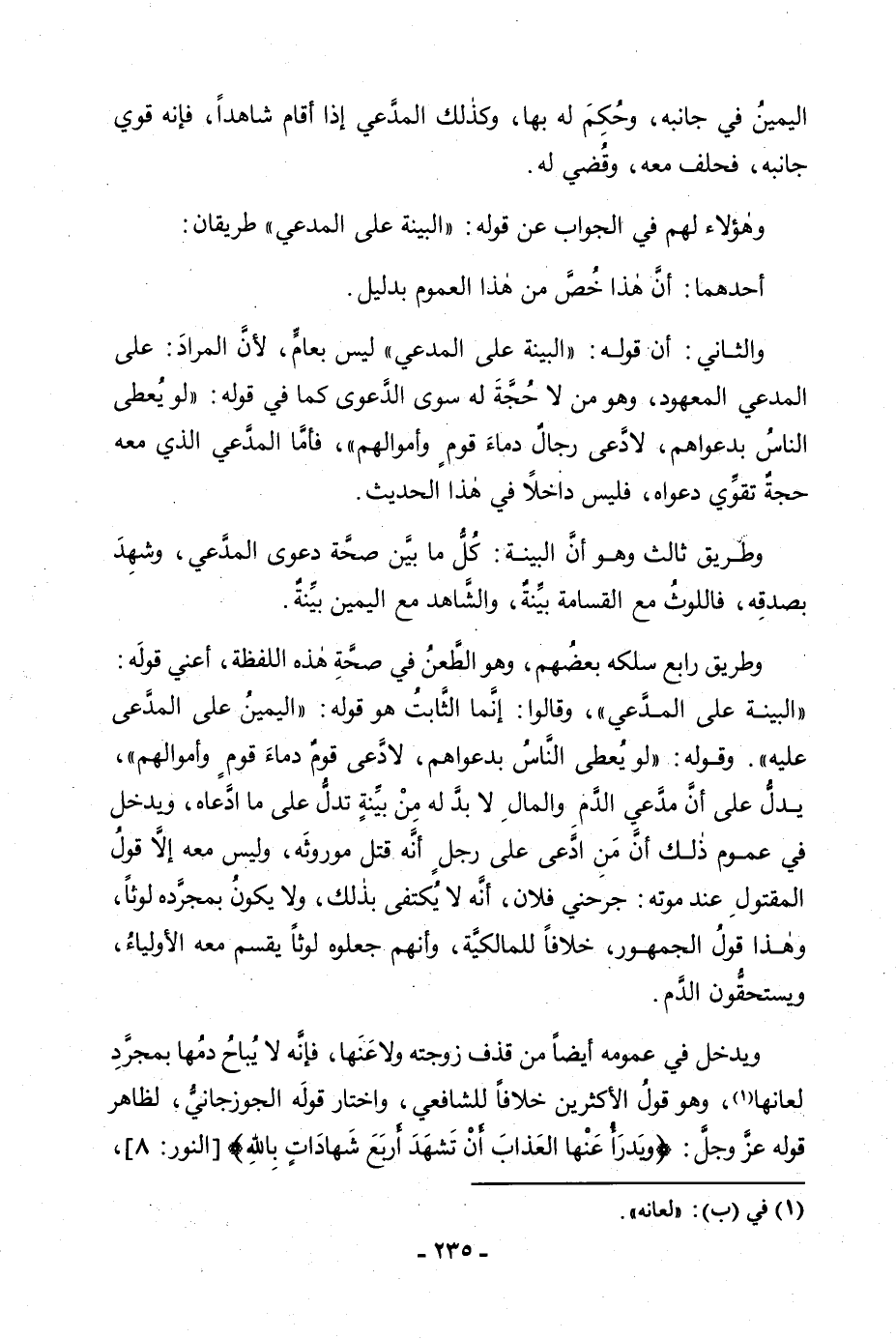 وَهَؤُلَاءِ لَهُمْ فِي الْجَوَابِ عَنْ قَوْلِهِ: الْبَيِّنَةُ عَلَى الْمُدَّعِي طَرِيقَانِ: أَحَدُهُمَا: أَنَّ هَذَا خُصَّ مِنْ هَذَا الْعُمُومِ بِدَلِيلٍ.