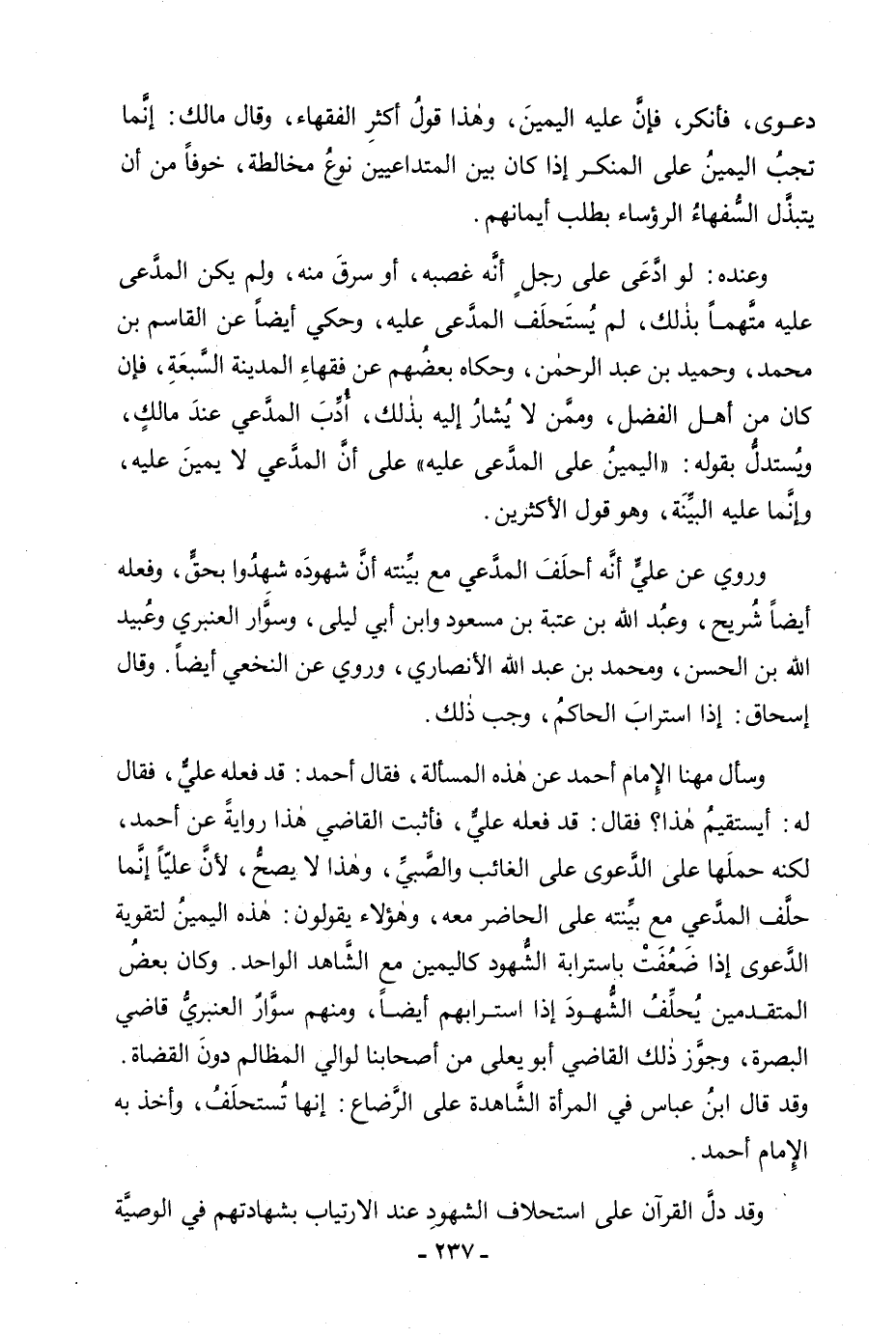 وَسَأَلَ مُهَنَّا الْإِمَامَ أَحْمَدَ عَنْ هَذِهِ الْمَسْأَلَةِ، فَقَالَ أَحْمَدُ: قَدْ فَعَلَهُ عَلِيٌّ، فَقَالَ لَهُ: أَيَسْتَقِيمُ هَذَا؟ فَقَالَ: قَدْ فَعَلَهُ عَلِيٌّ، فَأَثْبَتَ الْقَاضِي هَذِهِ رِوَايَةً عَنْ أَحْمَدَ، لَكِنَّهُ حَمَلَهَا عَلَى الدَّعْوَى عَلَى الْغَائِبِ وَالصَّبِيِّ، وَهَذَا لَا يَصِحُّ، لِأَنَّ عَلِيًّا إِنَّمَا حَلَّفَ الْمُدَّعِيَ مَعَ بَيِّنَتِهِ عَلَى الْحَاضِرِ مَعَهُ، وَهَؤُلَاءِ يَقُولُونَ: هَذِهِ الْيَمِينُ لِتَقْوِيَةِ الدَّعْوَى إِذَا ضَعُفَتْ بِاسْتِرَابَةِ الشُّهُودِ كَالْيَمِينِ مَعَ الشَّاهِدِ الْوَاحِدِ. وَكَانَ بَعْضُ الْمُتَقَدِّمِينَ يُحَلِّفُ الشُّهُودَ إِذَا اسْتَرَابَهُمْ أَيْضًا، وَمِنْهُمْ سَوَّارٌ الْعَنْبَرِيُّ قَاضِي الْبَصْرَةَ، وَجَوَّزَ ذَلِكَ الْقَاضِي أَبُو يَعْلَى مِنْ أَصْحَابِنَا لِوَالِي الْمَظَالِمِ دُونَ الْقُضَاةِ. وَقَدْ قَالَ ابْنُ عَبَّاسٍ فِي الْمَرْأَةِ الشَّاهِدَةِ عَلَى الرَّضَاعِ: إِنَّهَا تُسْتَحْلَفُ وَأَخَذَ بِهِ الْإِمَامُ أَحْمَدُ.