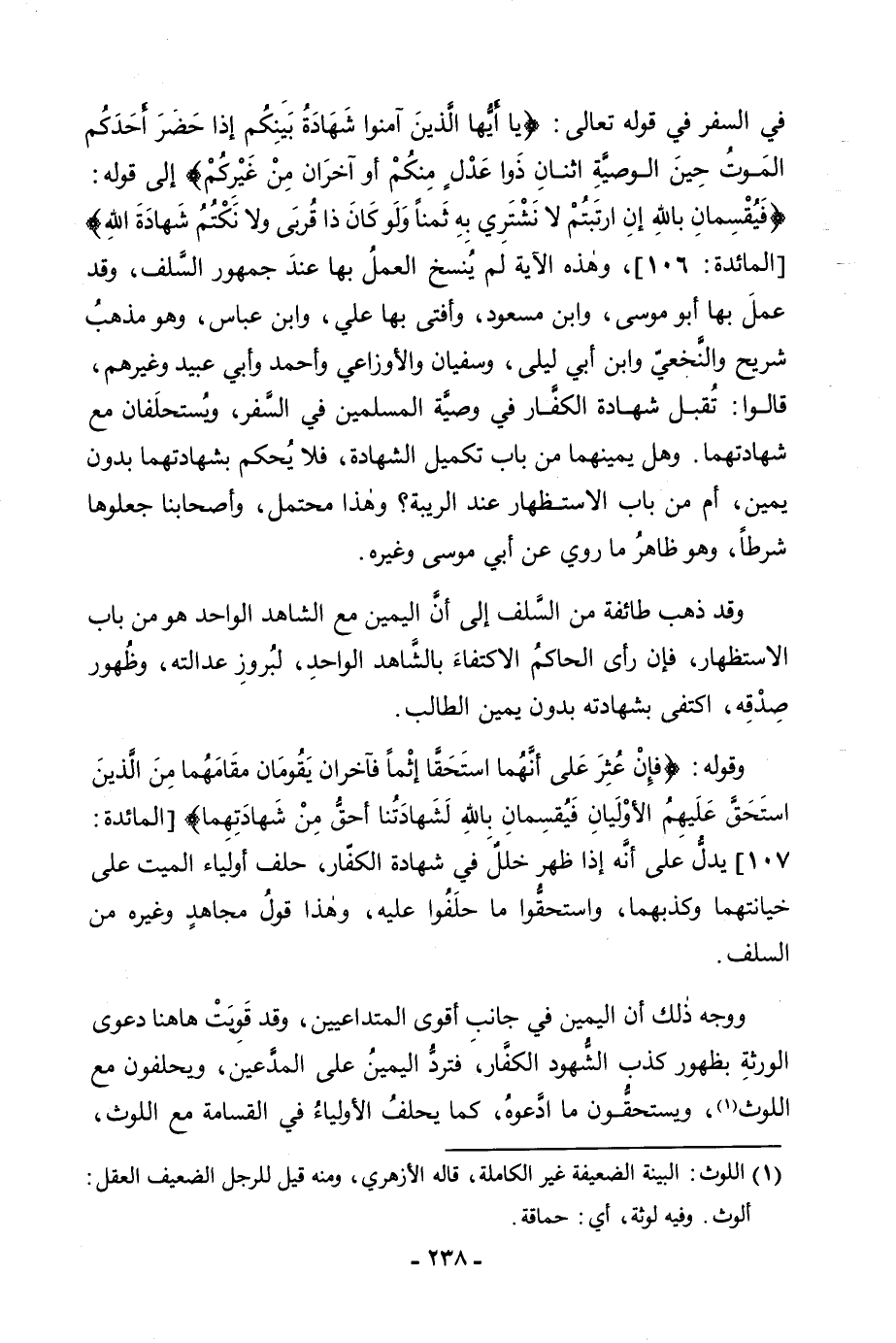 فِي السَّفَرِ فِي قَوْلِهِ تَعَالَى: {يَاأَيُّهَا الَّذِينَ آمَنُوا شَهَادَةُ بَيْنِكُمْ إِذَا حَضَرَ أَحَدَكُمُ الْمَوْتُ حِينَ الْوَصِيَّةِ اثْنَانِ ذَوَا عَدْلٍ مِنْكُمْ أَوْ آخَرَانِ مِنْ غَيْرِكُمْ} [المائدة: 106] إِلَى قَوْلِهِ: {فَيُقْسِمَانِ بِاللَّهِ إِنِ ارْتَبْتُمْ لَا نَشْتَرِي بِهِ ثَمَنًا وَلَوْ كَانَ ذَا قُرْبَى وَلَا نَكْتُمُ شَهَادَةَ اللَّهِ} [المائدة: 106] [الْمَائِدَةِ: 106] ، وَهَذِهِ الْآيَةُ لَمْ يُنْسَخِ الْعَمَلُ بِهَا عِنْدَ جُمْهُورِ السَّلَفِ، وَقَدْ عَمِلَ بِهَا أَبُو مُوسَى، وَابْنُ مَسْعُودٍ، وَأَفْتَى بِهَا عَلِيٌّ، وَابْنُ عَبَّاسٍ، وَهُوَ مَذْهَبُ شُرَيْحٍ وَالنَّخَعِيِّ وَابْنِ أَبِي لَيْلَى وَسُفْيَانَ وَالْأَوْزَاعِيِّ وَأَحْمَدَ وَأَبُو عُبَيْدٍ وَغَيْرِهِمْ، قَالُوا: تُقْبَلُ شَهَادَةُ الْكُفَّارِ فِي وَصِيَّةِ الْمُسْلِمِينَ فِي السَّفَرِ، وَيُسْتَحْلَفَانِ مَعَ شَهَادَتِهِمَا. وَهَلْ يَمِينُهُمَا مِنْ بَابِ تَكْمِيلِ الشَّهَادَةِ، فَلَا يُحْكَمُ بِشَهَادَتِهِمَا بِدُونِ يَمِينٍ، أَمْ مِنْ بَابِ الِاسْتِظْهَارِ عِنْدَ الرِّيبَةِ؟ وَهَذَا مُحْتَمَلٌ، وَأَصْحَابُنَا جَعَلُوهَا شَرْطًا، وَهُوَ ظَاهِرُ مَا رُوِيَ عَنْ أَبِي مُوسَى وَغَيْرِهِ.