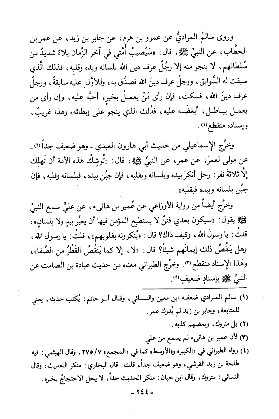 وَرَوَى سَالِمٌ الْمُرَادِيُّ عَنْ عَمْرِو بْنِ هَرِمٍ، عَنْ جَابِرِ بْنِ زَيْدٍ، عَنْ عُمَرَ بْنِ الْخَطَّابِ، عَنِ النَّبِيِّ صَلَّى اللَّهُ عَلَيْهِ وَسَلَّمَ، قَالَ: «سَيُصِيبُ أُمَّتِي فِي آخِرِ الزَّمَانِ بَلَاءٌ شَدِيدٌ مِنْ سُلْطَانِهِمْ، لَا يَنْجُو مِنْهُ إِلَّا رَجُلٌ عَرَفَ دِينَ اللَّهِ بِلِسَانِهِ وَيَدِهِ وَقَلْبِهِ، فَذَلِكَ الَّذِي سَبَقَتْ لَهُ السَّوَابِقُ، وَرَجُلٌ عَرَفَ دِينَ اللَّهِ فَصَدَّقَ بِهِ، وَلِلْأَوَّلِ عَلَيْهِ سَابِقَةٌ، وَرَجُلٌ عَرَفَ دِينَ اللَّهِ، فَسَكَتَ، فَإِنْ رَأَى مَنْ يَعْمَلُ بِخَيْرٍ أَحَبَّهُ عَلَيْهِ، وَإِنْ رَأَى مَنْ يَعْمَلُ بِبَاطِلٍ أَبْغَضَهُ عَلَيْهِ، فَذَلِكَ الَّذِي يَنْجُو عَلَى إِبْطَائِهِ» وَهَذَا غَرِيبٌ، وَإِسْنَادُهُ مُنْقَطِعٌ.