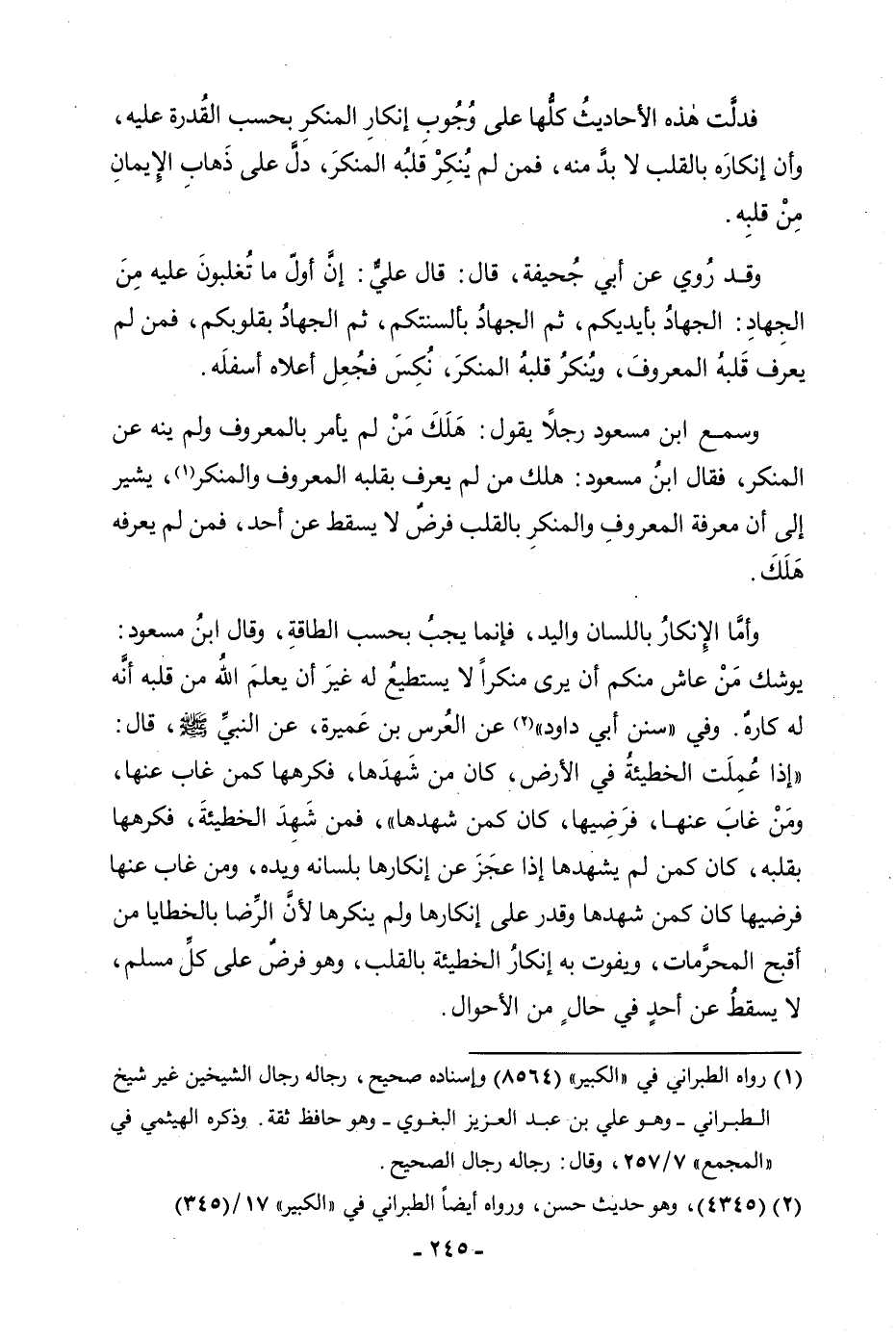 فَدَلَّتْ هَذِهِ الْأَحَادِيثُ كُلُّهَا عَلَى وُجُوبِ إِنْكَارِ الْمُنْكَرِ بِحَسَبِ الْقُدْرَةِ عَلَيْهِ، وَأَمَّا إِنْكَارُهُ بِالْقَلْبِ لَا بُدَّ مِنْهُ، فَمَنْ لَمْ يُنْكِرْ قَلْبُهُ الْمُنْكَرَ، دَلَّ عَلَى ذَهَابِ الْإِيمَانِ مِنْ قَلْبِهِ.